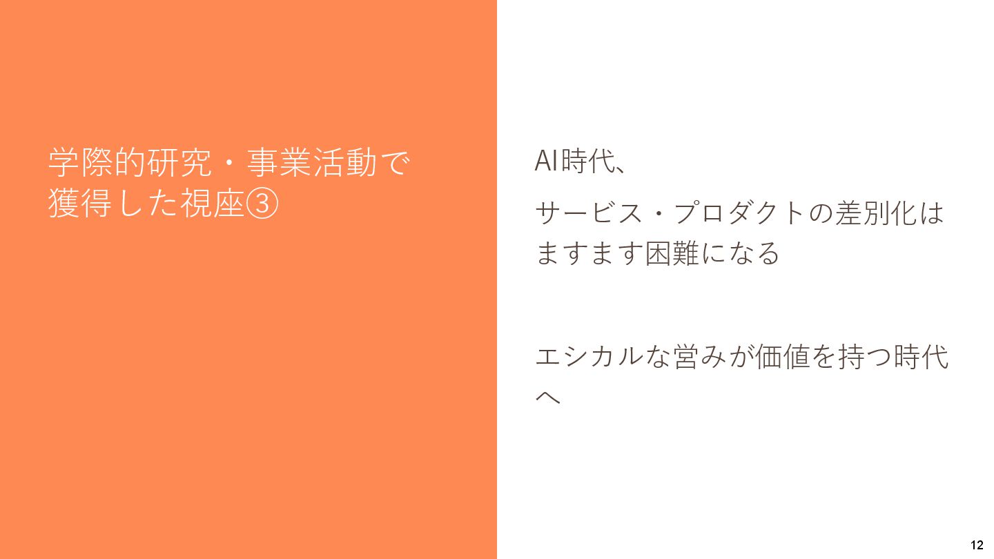 学際的研究・事業活動で 獲得した視座③ AI時代、 サービス・プロダクトの差別化は ますます困難になる エシカルな営みが価値を持つ時代 へ 12