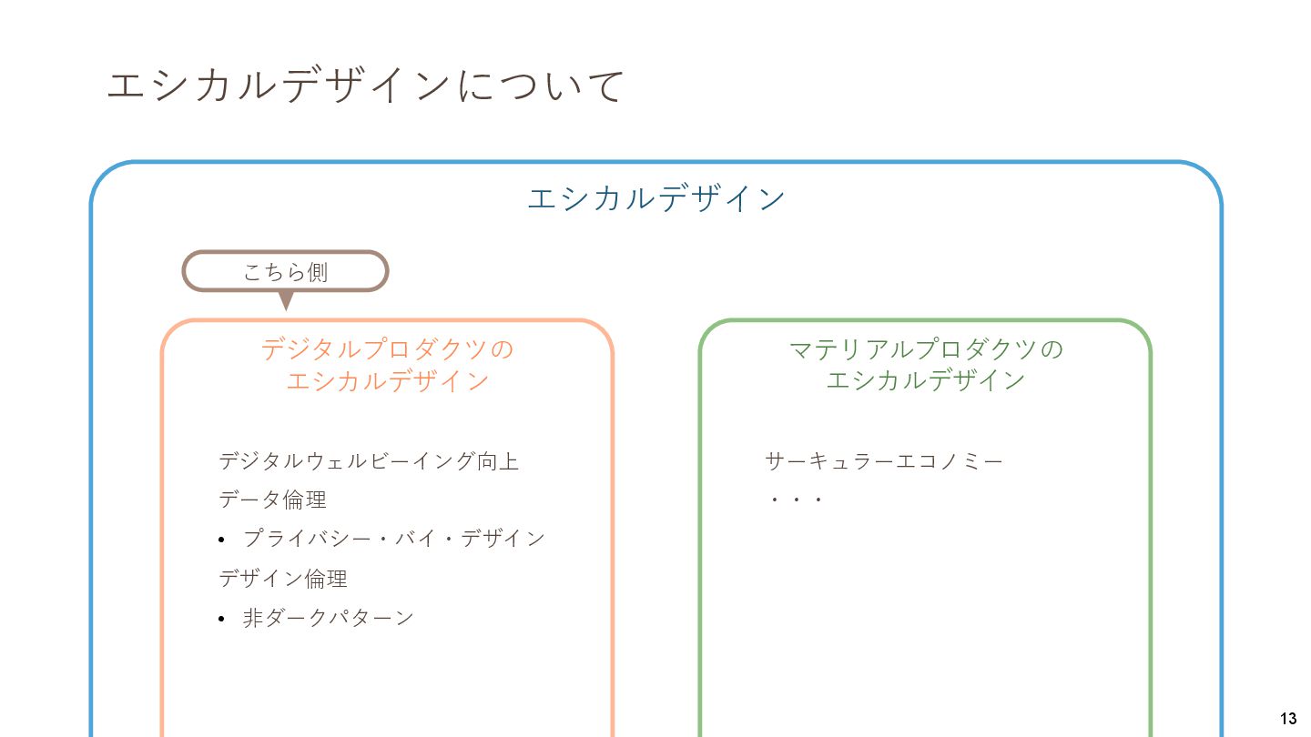 エシカルデザインについて 13 エシカルデザイン デジタルプロダクツの エシカルデザイン マテリアルプロダクツの エシカルデザイン こちら側 デジタルウェルビーイング向上 データ倫理