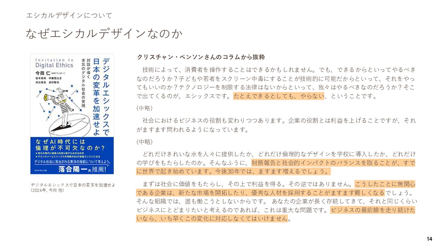 なぜエシカルデザインなのか デジタルエシックスで日本の変革を加速せよ (2024年, 今岡 他) 14 技術によって、消費者を操作することはできるかもしれません。でも、できるからといってやるべき なのだろうか?子どもや若者をスクリーン中毒にすることが技術的に可能だからといって、それをやっ てもいいのか?テクノロジーを制限する法律はないからといって、我々はやるべきなのだろうか?そこ で出てくるのが、エシックスです。たとえできるとしても、やらない、ということです。