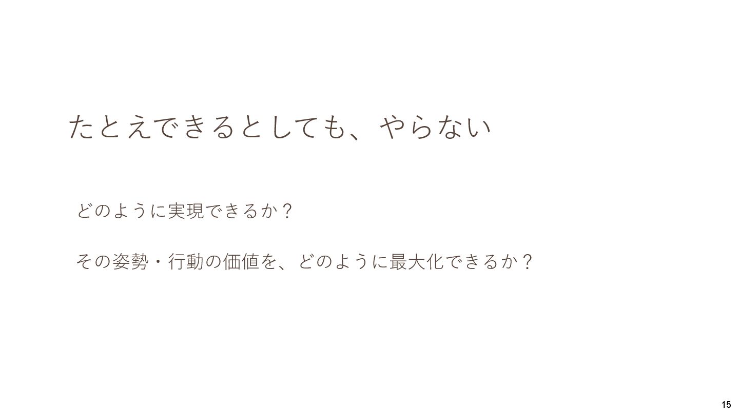 たとえできるとしても、やらない 15 その姿勢・行動の価値を、どのように最大化できるか? どのように実現できるか?