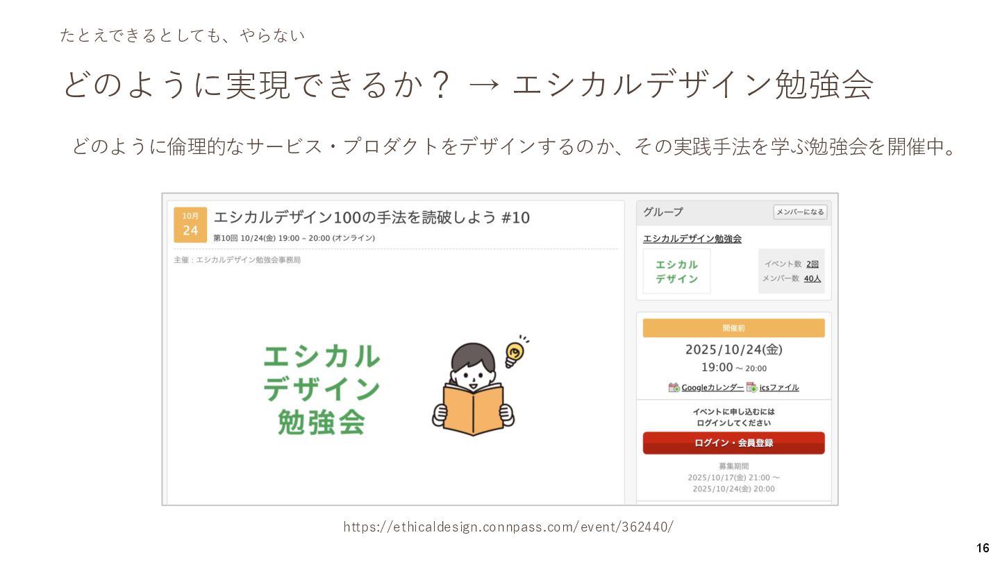 16 どのように倫理的なサービス・プロダクトをデザインするのか、その実践手法を学ぶ勉強会を開催中。 どのように実現できるか? → エシカルデザイン勉強会 https://ethicaldesign.connpass.com/event/362440/ たとえできるとしても、やらない