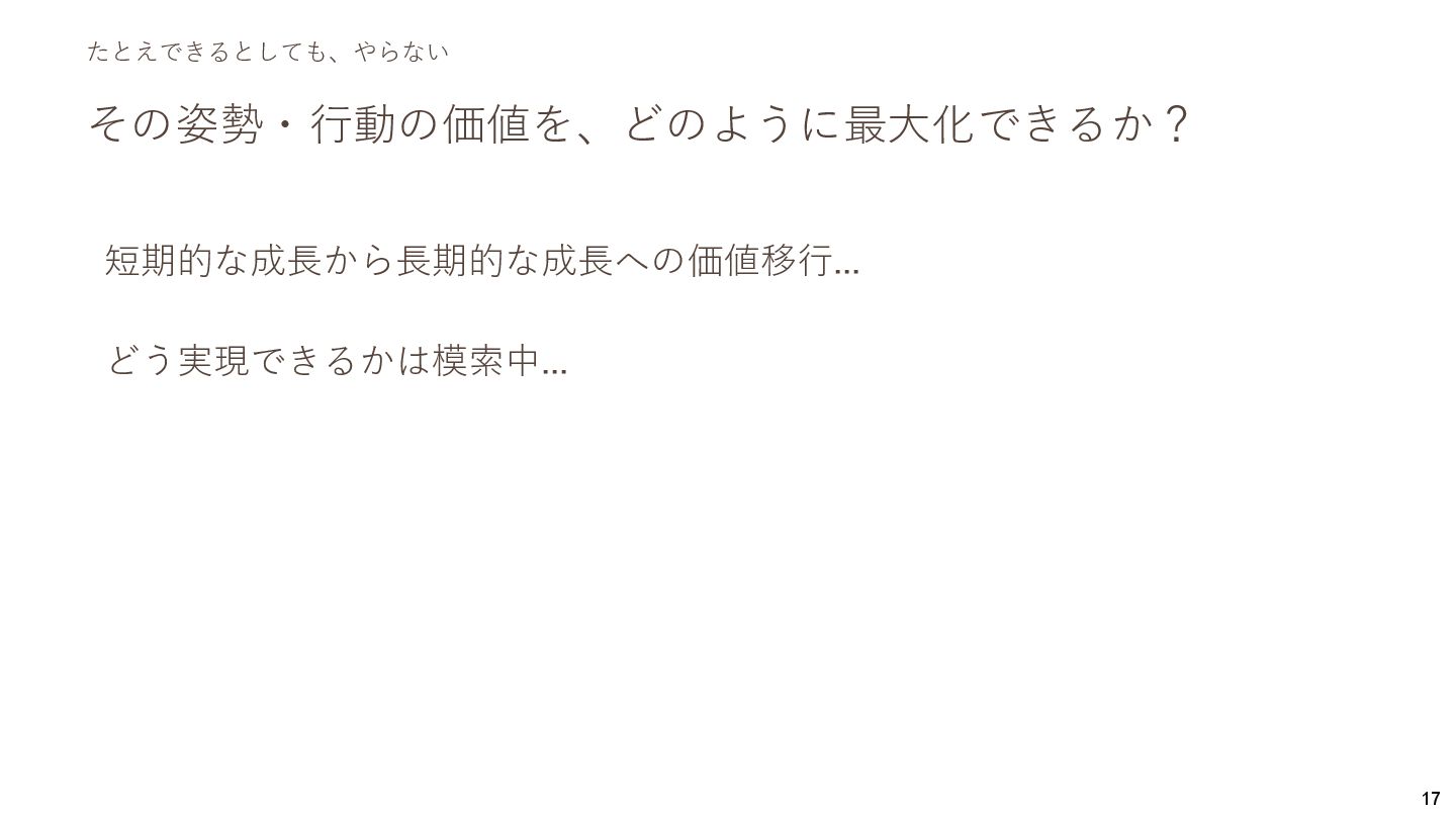 17 短期的な成長から長期的な成長への価値移行... その姿勢・行動の価値を、どのように最大化できるか? たとえできるとしても、やらない どう実現できるかは模索中...