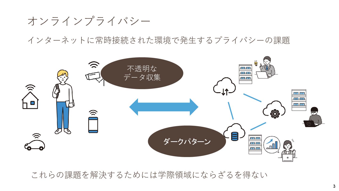オンラインプライバシー 3 インターネットに常時接続された環境で発生するプライバシーの課題 不透明な データ収集 ダークパターン これらの課題を解決するためには学際領域にならざるを得ない