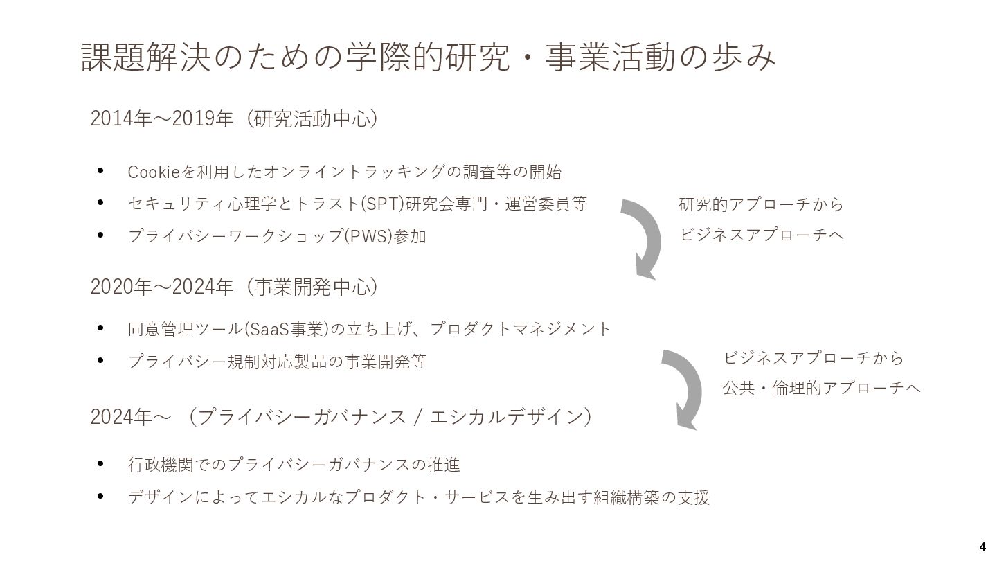 2024年〜 (プライバシーガバナンス / エシカルデザイン) • 同意管理ツール(SaaS事業)の立ち上げ、プロダクトマネジメント • プライバシー規制対応製品の事業開発等 • 行政機関でのプライバシーガバナンスの推進 • デザインによってエシカルなプロダクト・サービスを生み出す組織構築の支援 研究的アプローチから ビジネスアプローチへ ビジネスアプローチから 公共・倫理的アプローチへ