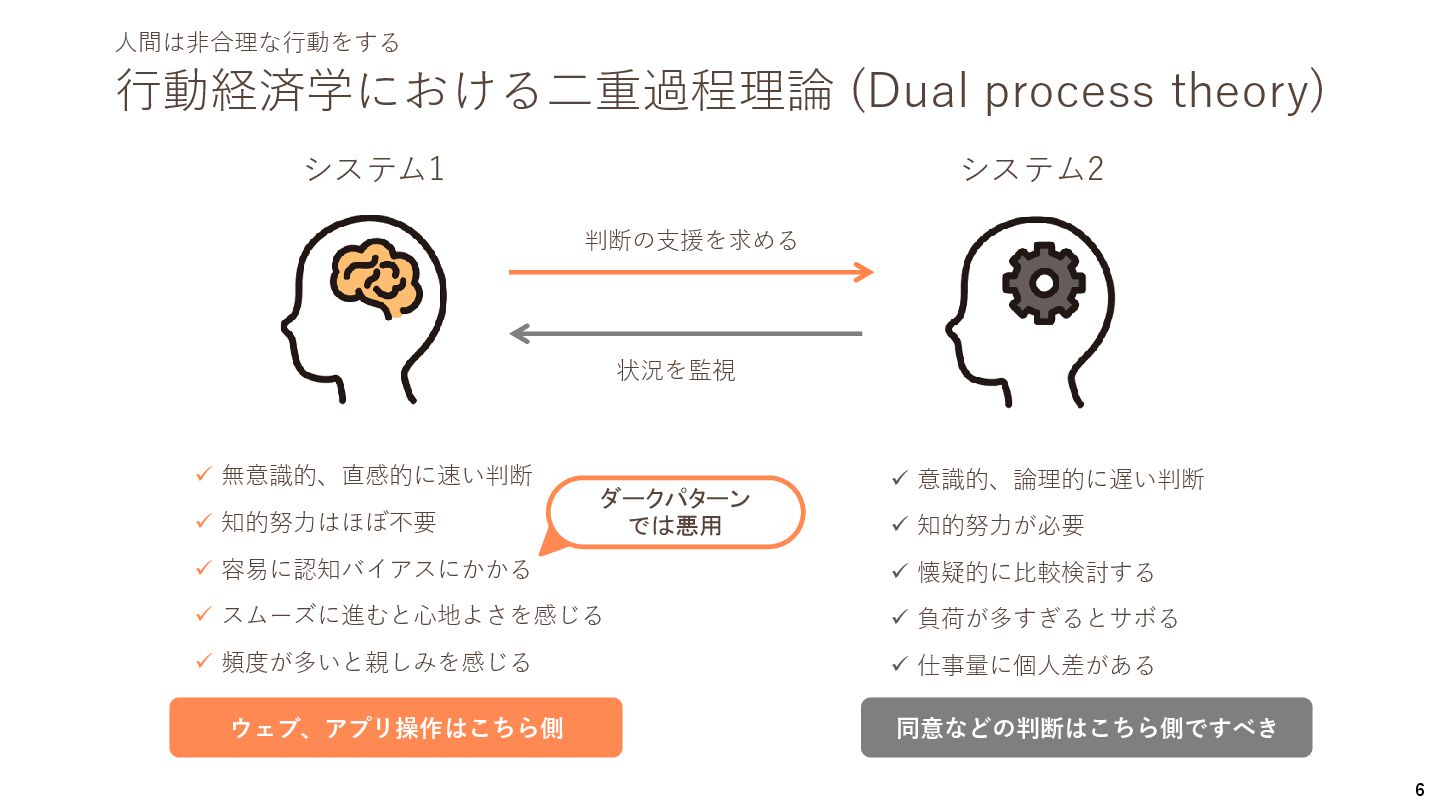 頻度が多いと親しみを感じる 6 行動経済学における二重過程理論 (Dual process theory) システム2 ✓ 意識的、論理的に遅い判断 ✓ 知的努力が必要 ✓ 懐疑的に比較検討する ✓ 負荷が多すぎるとサボる ✓ 仕事量に個人差がある 判断の支援を求める 状況を監視 ウェブ、アプリ操作はこちら側 同意などの判断はこちら側ですべき ダークパターン では悪用 人間は非合理な行動をする