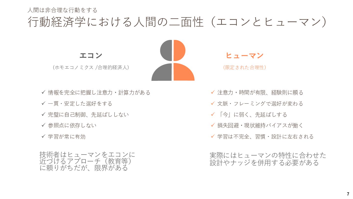 ✓ 情報を完全に把握し注意力・計算力がある ✓ 一貫・安定した選好をする ✓ 完璧に自己制御、先延ばししない ✓ 参照点に依存しない ✓ 学習が常に有効 ✓ 注意力・時間が有限、経験則に頼る ✓ 文脈・フレーミングで選好が変わる ✓ 「今」に弱く、先延ばしする ✓ 損失回避・現状維持バイアスが働く ✓ 学習は不完全、習慣・設計に左右される 実際にはヒューマンの特性に合わせた 設計やナッジを併用する必要がある 人間は非合理な行動をする