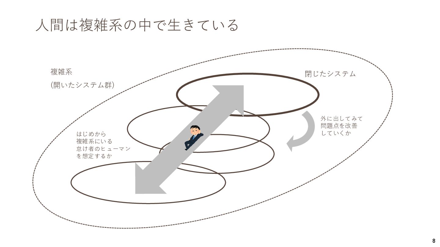 閉じたシステム 8 人間は複雑系の中で生きている はじめから 複雑系にいる 怠け者のヒューマン を想定するか 複雑系 (開いたシステム群) 外に出してみて