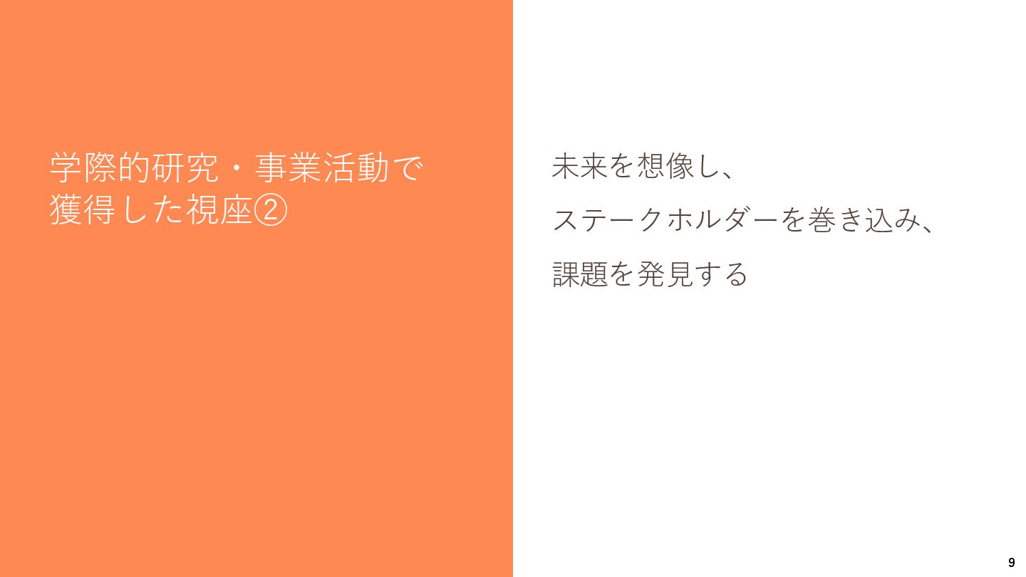 学際的研究・事業活動で 獲得した視座② 未来を想像し、 ステークホルダーを巻き込み、 課題を発見する 9
