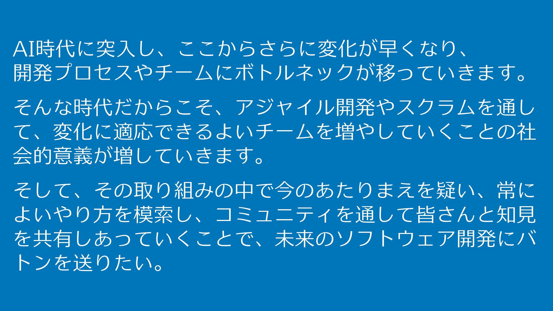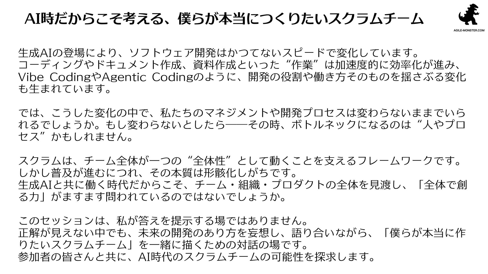 参加者の皆さんと共に、AI時代のスクラムチームの可能性を探求します。