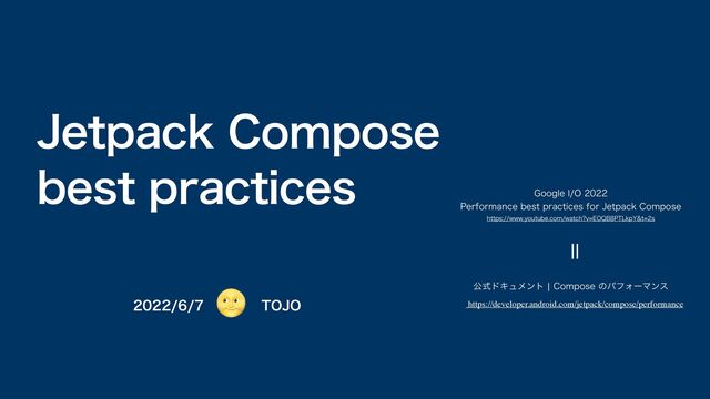 ɹ50+0ɹ +FUQBDL$PNQPTF CFTUQSBDUJDFT https://developer.android.com/jetpack/compose/performance ެࣜυΩϡϝϯτc$PNQPTFͷύϑΥʔϚϯε ʹ 🌝 (PPHMF*0 1FSGPSNBODFCFTUQSBDUJDFTGPS+FUQBDL$PNQPTF IUUQTXXXZPVUVCFDPNXBUDI