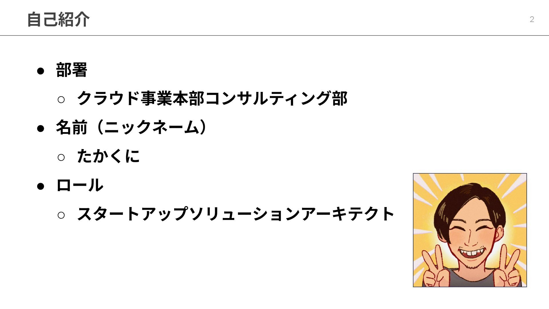 • 部署 ◦ クラウド事業本部コンサルティング部 • 名前(ニックネーム) ◦ たかくに • ロール