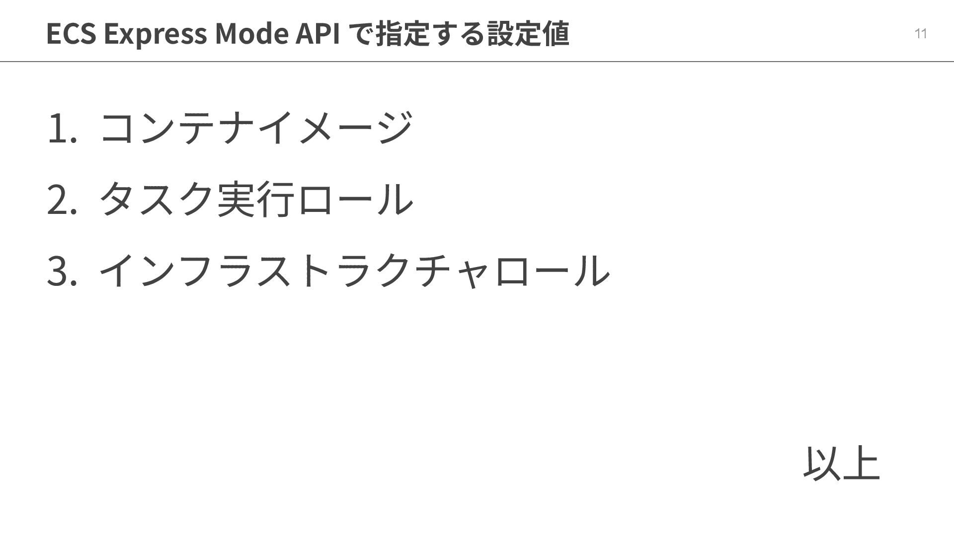 10 ECS Express Mode 設定値を最⼩ 3 つまで絞り、 残りを AWS が定めたデフォルト値に委ねて、