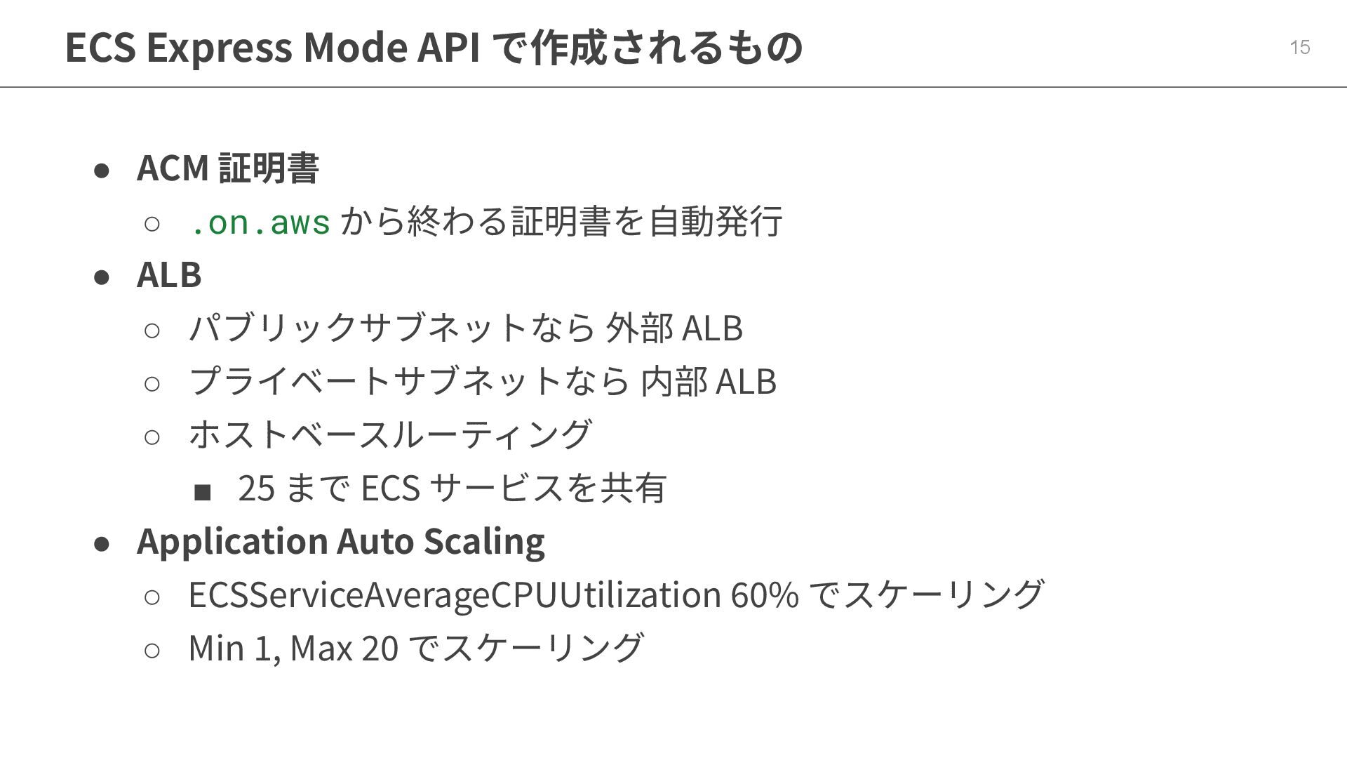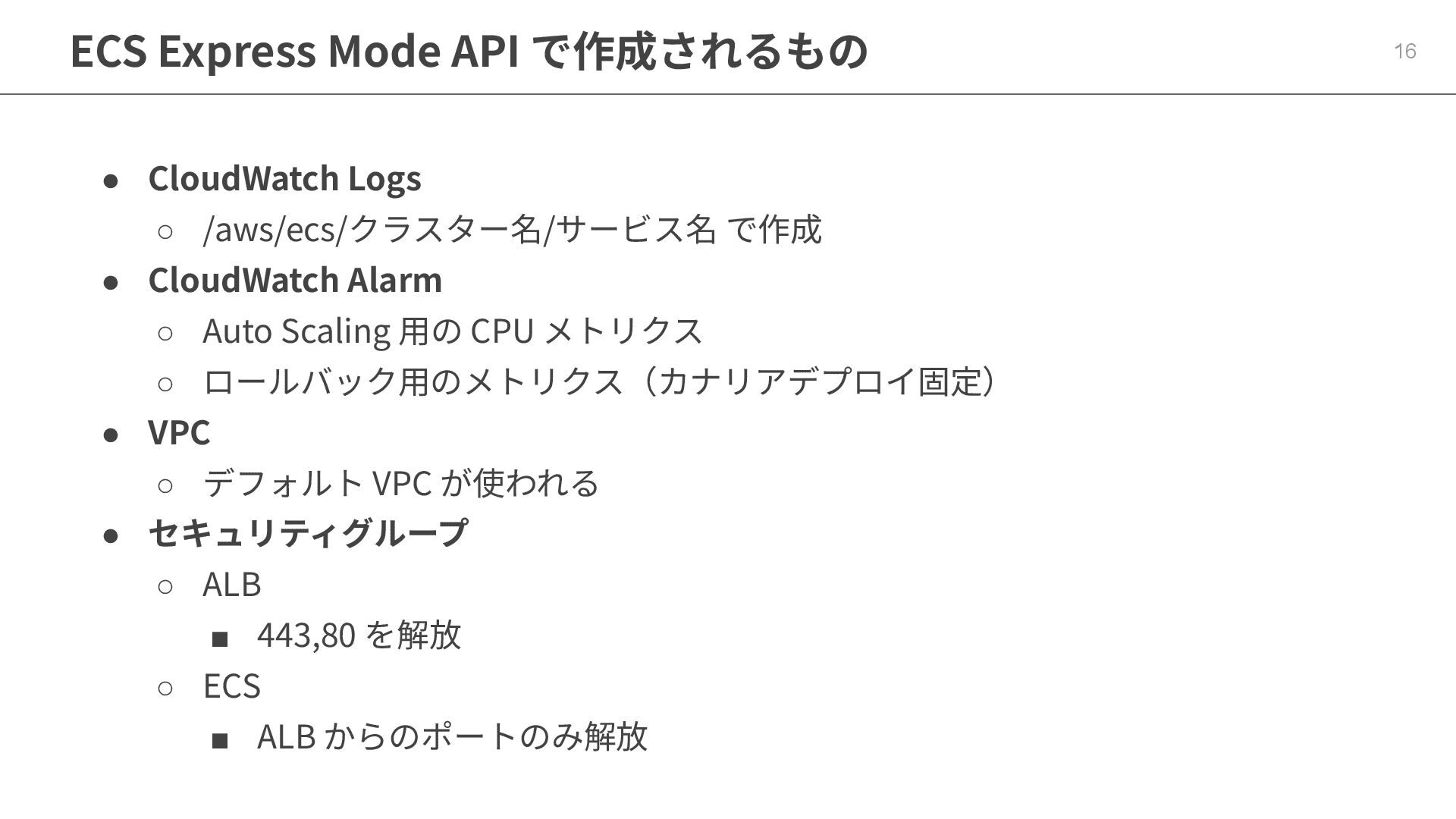 外部 ALB ◦ プライベートサブネットなら 内部 ALB ◦ ホストベースルーティング ▪ 25 まで ECS サービスを共有 • Application Auto Scaling ◦ ECSServiceAverageCPUUtilization 60% でスケーリング ◦ Min 1, Max 20 でスケーリング 15 ECS Express Mode API で作成されるもの