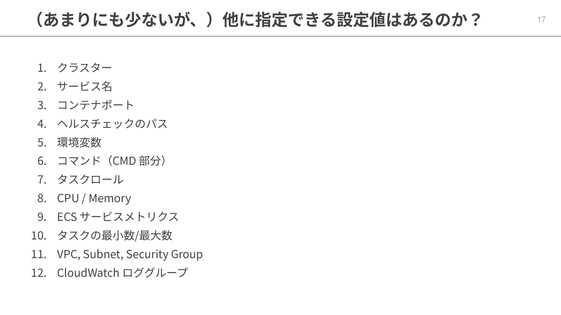6. コマンド(CMD 部分) 7. タスクロール 8. CPU / Memory 9. ECS サービスメトリクス 10. タスクの最⼩数/最⼤数 11. VPC, Subnet, Security Group 12. CloudWatch ロググループ 17 (あまりにも少ないが、)他に指定できる設定値はあるのか?