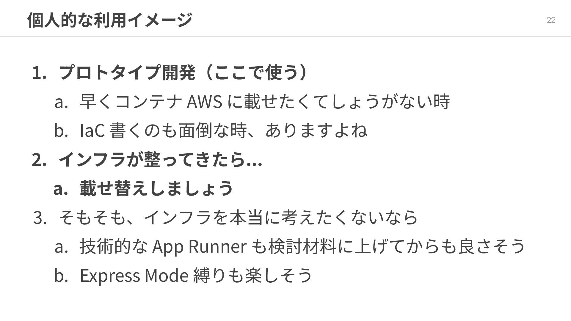 インフラが整ってきたら... a. 載せ替えしましょう 3. そもそも、インフラを本当に考えたくないなら a. 技術的な App Runner も検討材料に上げてからも良さそう b. Express Mode 縛りも楽しそう 22 個⼈的な利⽤イメージ