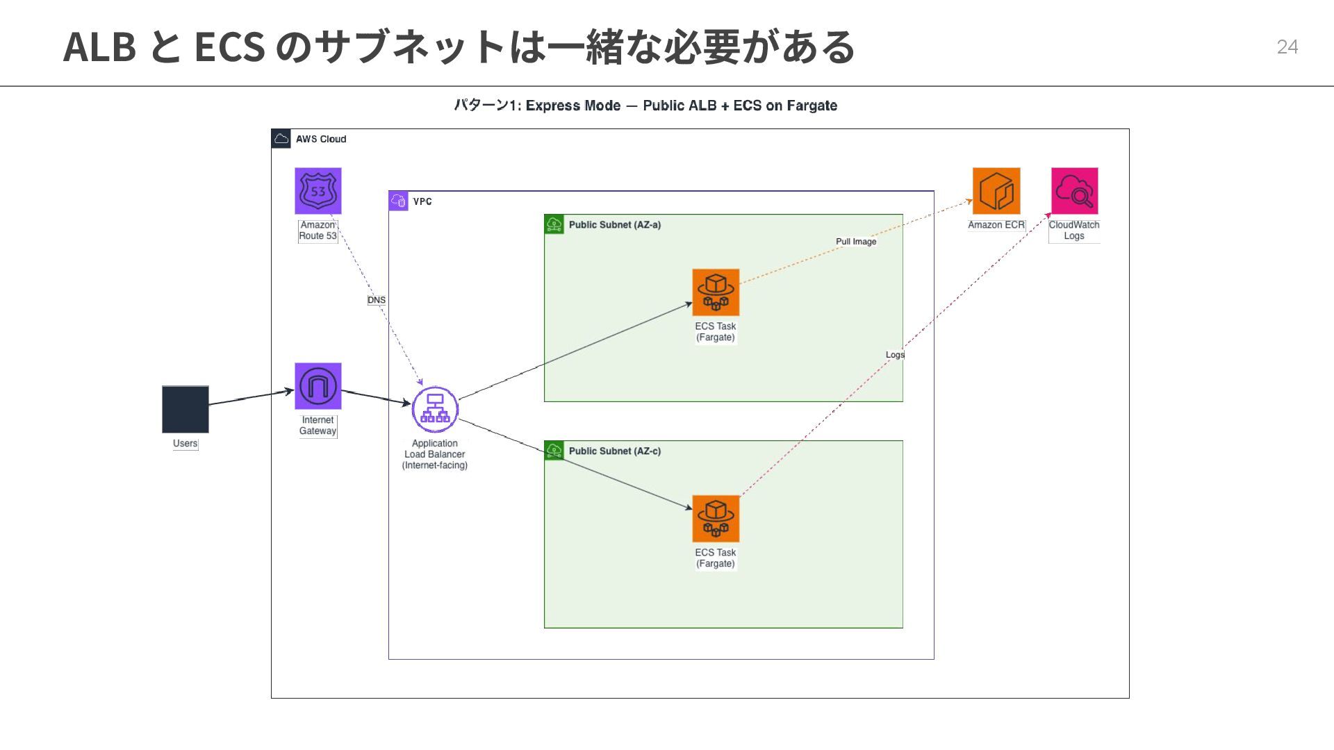 24 ALB と ECS のサブネットは⼀緒な必要がある