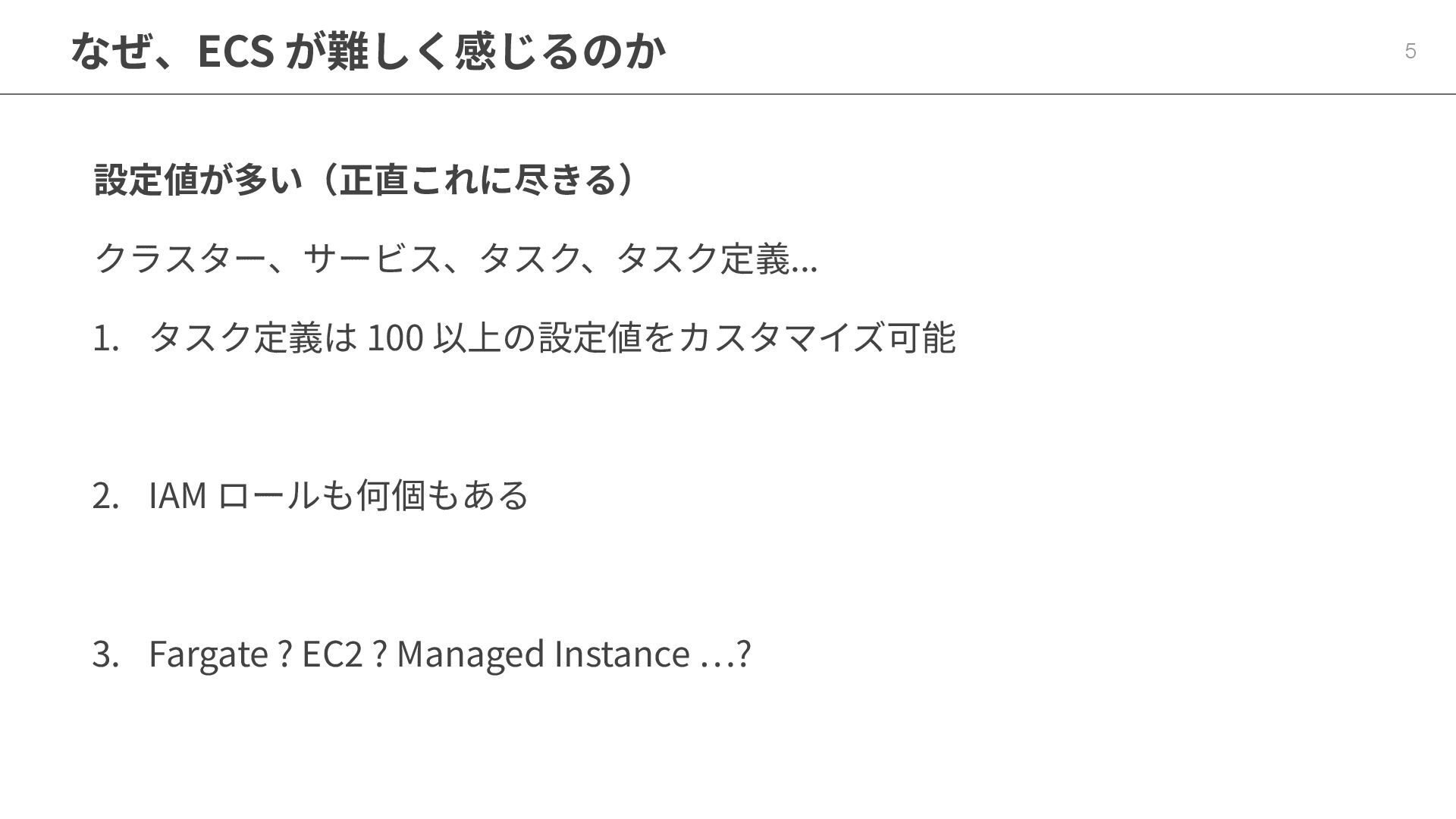 Fargate ? EC2 ? Managed Instance …? 5 なぜ、ECS が難しく感じるのか