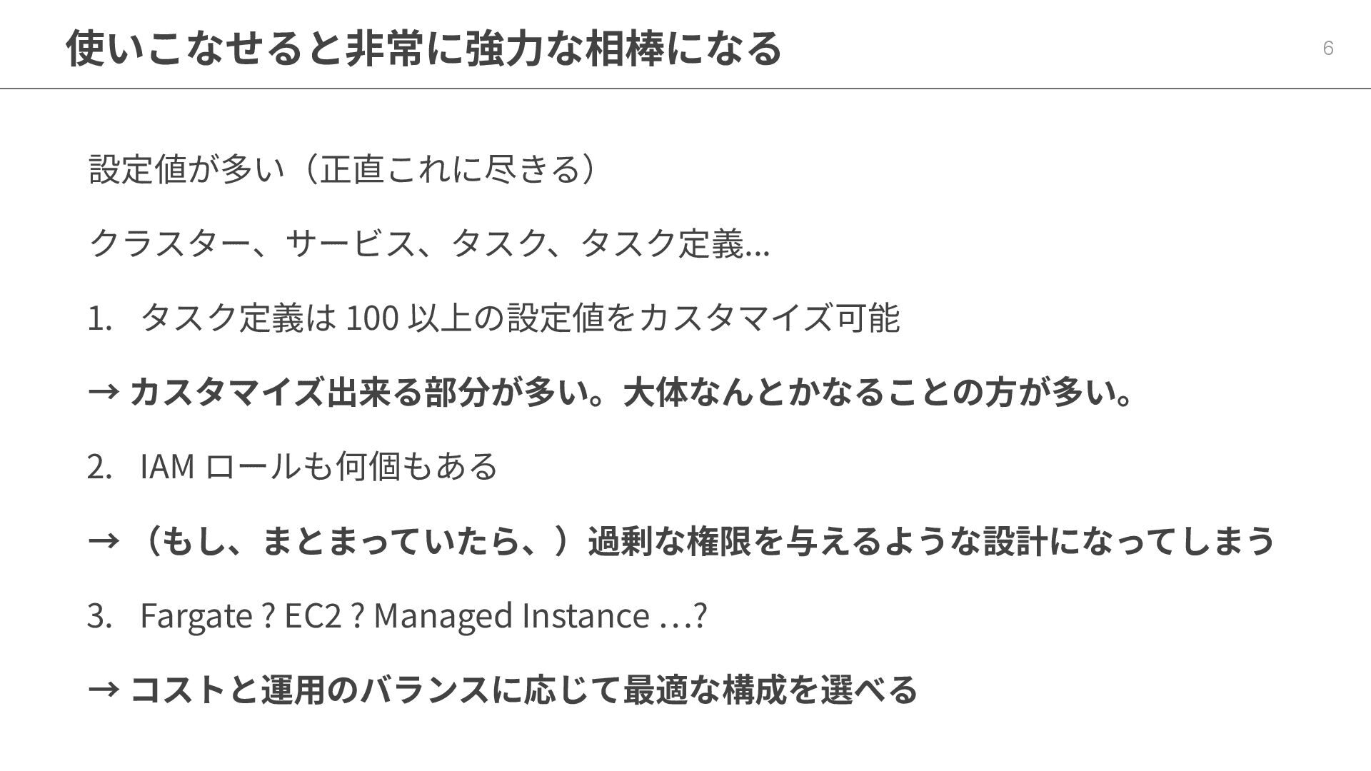 ロールも何個もある → (もし、まとまっていたら、)過剰な権限を与えるような設計になってしまう 3. Fargate ? EC2 ? Managed Instance …? → コストと運⽤のバランスに応じて最適な構成を選べる 6 使いこなせると⾮常に強⼒な相棒になる