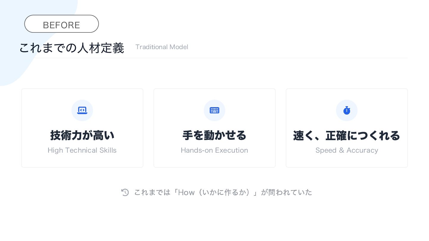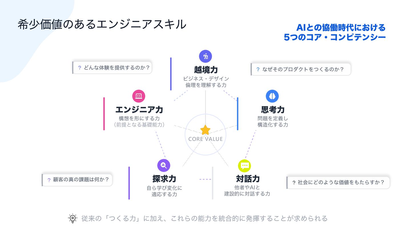 ࢥߟྗ ໰୊Λఆٛ͠ ߏ଄Խ͢Δྗ ର࿩ྗ ଞऀ΍"*ͱ ݐઃతʹର࿩͢Δྗ ୳ٻྗ ࣗΒֶͼมԽʹ దԠ͢Δྗ ΤϯδχΞྗ ߏ૝Λܗʹ͢Δྗ ʢલఏͱͳΔجૅೳྗʣ "*ͱͷڠಇ࣌୅ʹ͓͚Δ ͭͷίΞɾίϯϐςϯγʔ ैདྷͷʮͭ͘ΔྗʯʹՃ͑ɺ͜ΕΒͷೳྗΛ౷߹తʹൃش͢Δ͜ͱ͕ٻΊΒΕΔ