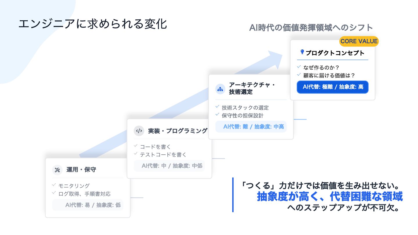 ࣮૷ɾϓϩάϥϛϯά ίʔυΛॻ͘ ςετίʔυΛॻ͘ "*୅ସத ந৅౓த௿ ΞʔΩςΫνϟɾ ٕज़બఆ ٕज़ελοΫͷબఆ อकੑͷ୲อઃܭ "*୅ସ೉ ந৅౓தߴ ϓϩμΫτίϯηϓτ ͳͥ࡞Δͷ͔ʁ ސ٬ʹಧ͚ΔՁ஋͸ʁ "*୅ସۃ೉ ந৅౓ߴ $03&7"-6&