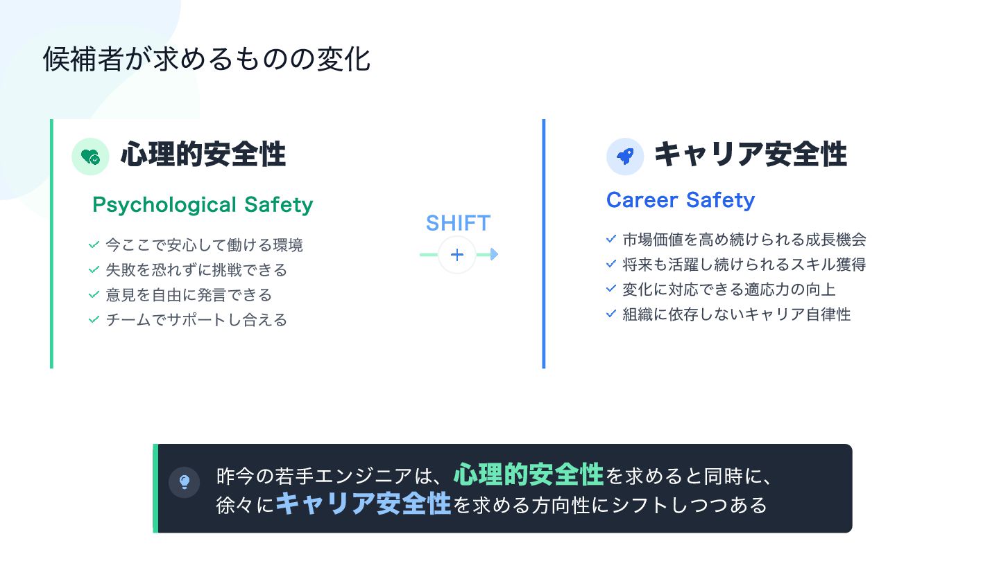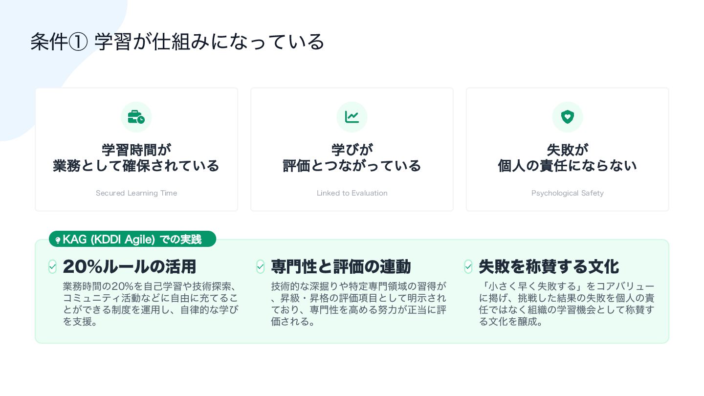 ͳ͘ʮ૊৫ͷઃܭʯͰܾ·Δɻ 10*/5 ৽ͨͳ҆શੑͷرٻ एखΤϯδχΞ͸ʮ৺ཧత҆શੑʯʹՃ͑ɺ ࢢ৔Ձ஋ΛߴΊΒΕΔʮΩϟϦΞ҆શੑʯΛٻΊ ͍ͯΔɻ 10*/5 ੒௕͢Δ૊৫ͷͭͷ৚݅ ֶश͕࢓૊Έʹͳ͍ͬͯΔʢϧʔϧ౳ʣ ਖ਼ղͷͳ͍໰͍͕͋Δ ૊৫ࣗମֶ͕श͍ͯ͠ΔʢධՁͱͷ࿈ಈʣ ৺ཧత҆શੑʢ໰͍ͱର࿩ͷจԽʣ ௅ઓ͕ͦ͜࠷େͷใुͱ͍͏Ձ஋؍ ࠾༻ͷ࠶ఆٛ ࠾༻͸ʮਓΛ୳͢࢓ࣄʯͰ͸ͳ͍ɻ ʮ੒௕؀ڥΛઃܭ͢Δ࢓ࣄʯͰ͋Δɻ 10*/5