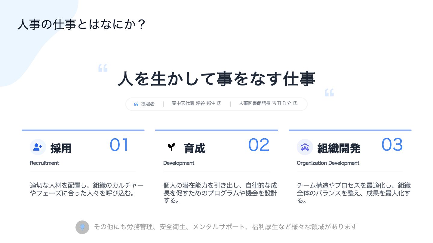 ༸հ ࢯ  ࠾༻ 3FDSVJUNFOU ద੾ͳਓࡐΛ഑ஔ͠ɺ૊৫ͷΧϧνϟʔ ΍ϑΣʔζʹ߹ͬͨਓʑΛݺͼࠐΉɻ  ҭ੒ %FWFMPQNFOU ݸਓͷજࡏೳྗΛҾ͖ग़͠ɺࣗ཯తͳ੒ ௕Λଅͨ͢ΊͷϓϩάϥϜ΍ػձΛઃܭ ͢Δɻ  ૊৫։ൃ 0SHBOJ[BUJPO%FWFMPQNFOU νʔϜߏ଄΍ϓϩηεΛ࠷దԽ͠ɺ૊৫ શମͷόϥϯεΛ੔͑ɺ੒ՌΛ࠷େԽ͢ Δɻ ਓΛੜ͔ͯ͠ࣄΛͳ͢࢓ࣄ ͦͷଞʹ΋࿑຿؅ཧɺ҆શӴੜɺϝϯλϧαϙʔτɺ෱རްੜͳͲ༷ʑͳྖҬ͕͋Γ·͢