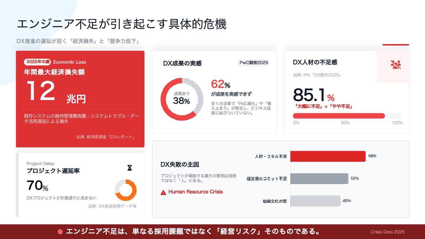 Ͱ͸ͳ͘ʮਓʯʹ͋Δɻ 1X$ௐࠪ )VNBO3FTPVSDF$SJTJT 1SPKFDU%FMBZ ϓϩδΣΫτ஗Ԇ཰  %9ϓϩδΣΫτ͕ܭը௨Γʹਐ·ͳ͍ ग़య%9ਪਐࢦඪσʔλ౳ ੒Ռ͋Γ  &DPOPNJD-PTT ೥ؒ࠷େܦࡁଛֹࣦ طଘγεςϜͷҡ࣋؅ཧඅߴಅɾγεςϜτϥϒϧɾσʔ λ׆༻஗ԆʹΑΔଛࣦ ೥ͷ֑  ஹԁ ग़యܦࡁ࢈ۀলʮ%9Ϩϙʔτʯ %9ਓࡐͷෆ଍ײ ग़య*1"ʮ%9ಈ޲ʯ  ʮେ෯ʹෆ଍ʯ ʮ΍΍ෆ଍ʯ    ΤϯδχΞෆ଍͸ɺ୯ͳΔ࠾༻՝୊Ͱ͸ͳ͘ʮܦӦϦεΫʯͦͷ΋ͷͰ͋Δɻ $SJTJT%BUB