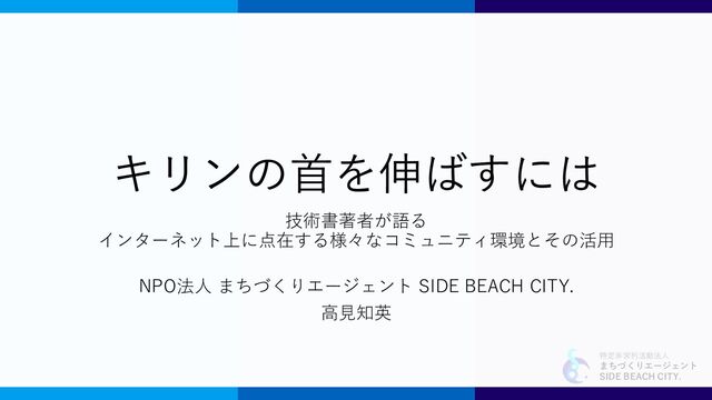 特定非営利活動法人 まちづくりエージェント SIDE BEACH CITY. キリンの首を伸ばすには 技術書著者が語る インターネット上に点在する様々なコミュニティ環境とその活用 NPO法人 まちづくりエージェント