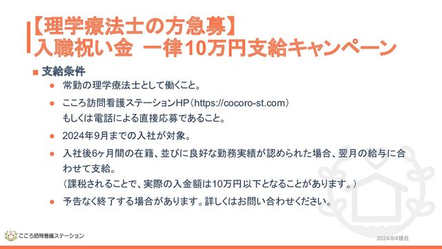 【理学療法士の方急募】 入職祝い金 一律10万円支給キャンペーン ▪ 支給条件 • 常勤の理学療法士として働くこと。 • こころ訪問看護ステーションHP(https://cocoro-st.com) もしくは電話による直接応募であること。