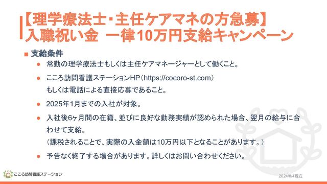 【理学療法士・主任ケアマネの方急募】 入職祝い金 一律10万円支給キャンペーン ▪ 支給条件 • 常勤の理学療法士もしくは主任ケアマネージャーとして働くこと。 • こころ訪問看護ステーションHP(https://cocoro-st.com) もしくは電話による直接応募であること。