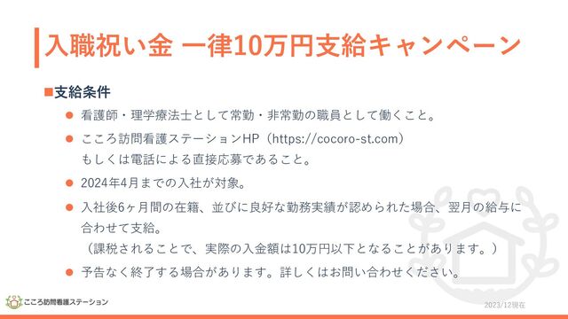 ⼊職祝い⾦ ⼀律10万円⽀給キャンペーン n⽀給条件 l 看護師・理学療法⼠として常勤・⾮常勤の職員として働くこと。 l こころ訪問看護ステーションHP(https://cocoro-st.com) もしくは電話による直接応募であること。 l 2024年4⽉までの⼊社が対象。