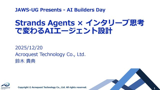 Agents × インタリーブ思考 で変わるAIエージェント設計 2025/12/20 Acroquest Technology Co., Ltd. 鈴木 貴典 1 JAWS-UG Presents - AI Builders Day