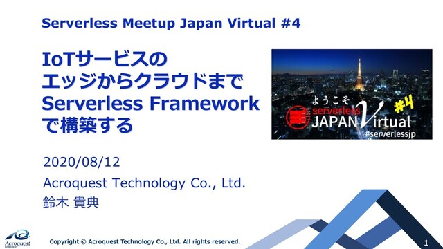 IoTサービスの エッジからクラウドまで Serverless Framework で構築する 2020/08/12 Acroquest Technology Co., Ltd. 鈴木 貴典 Serverless Meetup Japan Virtual #4