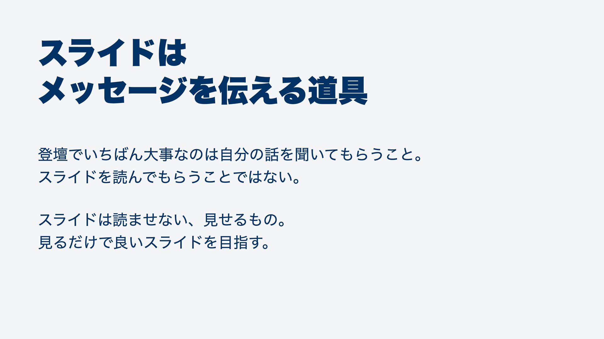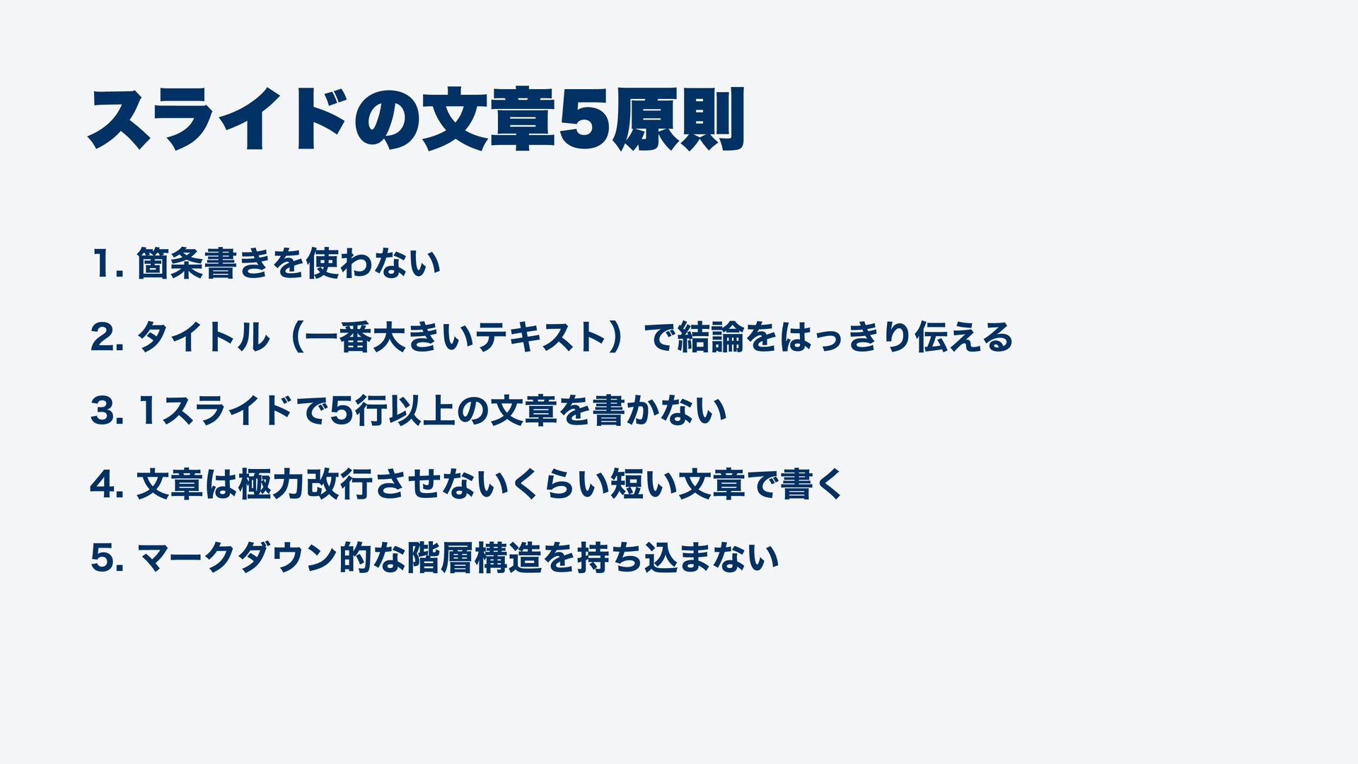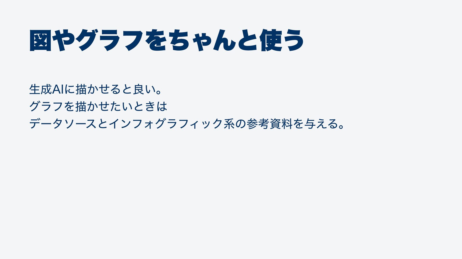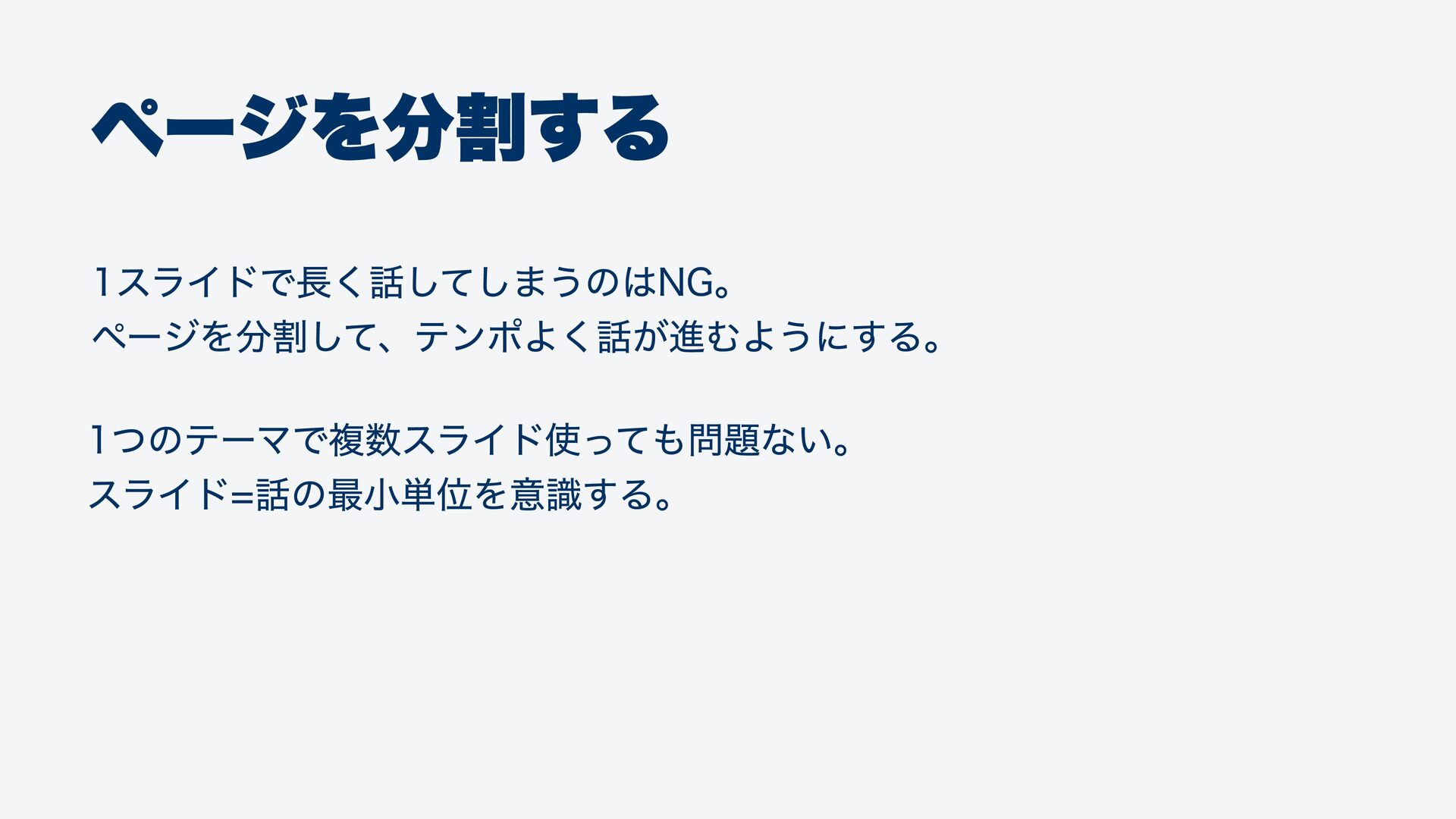 分 Part1 約 分 Part2 約 分 Part3 約 分 まとめ 約 分 5. コンテンツ 1スライド1メッセージ(タイトルで結論を言う) 1スライド5行以内の短い文章にする 箇条書き・階層構造(マークダウン的)は極力使わない コンテンツが「つながって」いる 無味乾燥なスライドや不要なアニメーションは排除する 6. ビジュアル・トンマナ カラー:ベース #003265(例)・アクセント #e69023(例) タイポグラフィ:最小フォントサイズ 48px ビジュアルの掟 左端揃え、余白を恐れない、コントラスト比 9:1、図解する、テキストのジャンプ率、