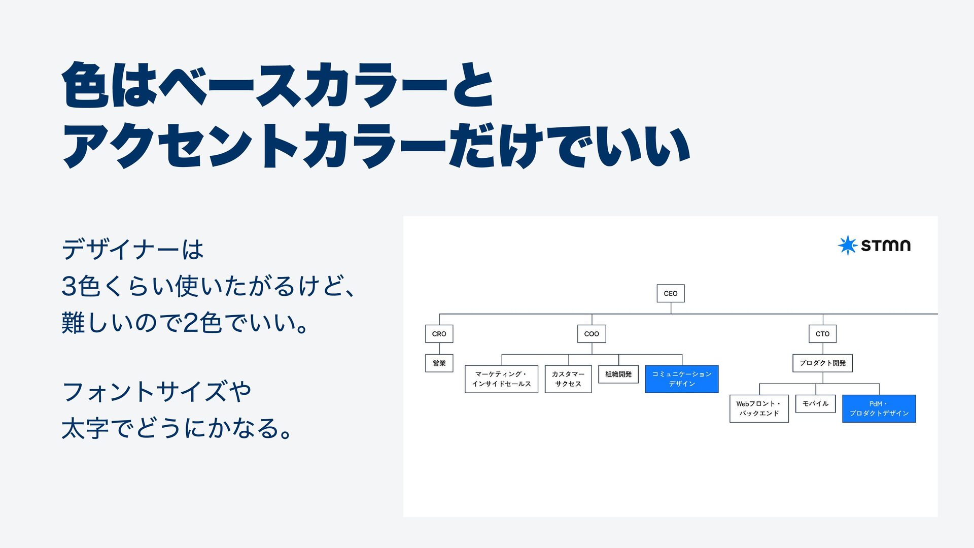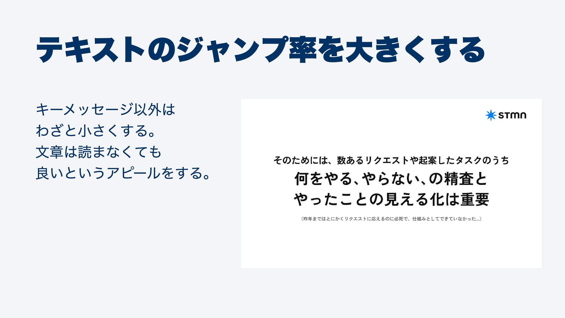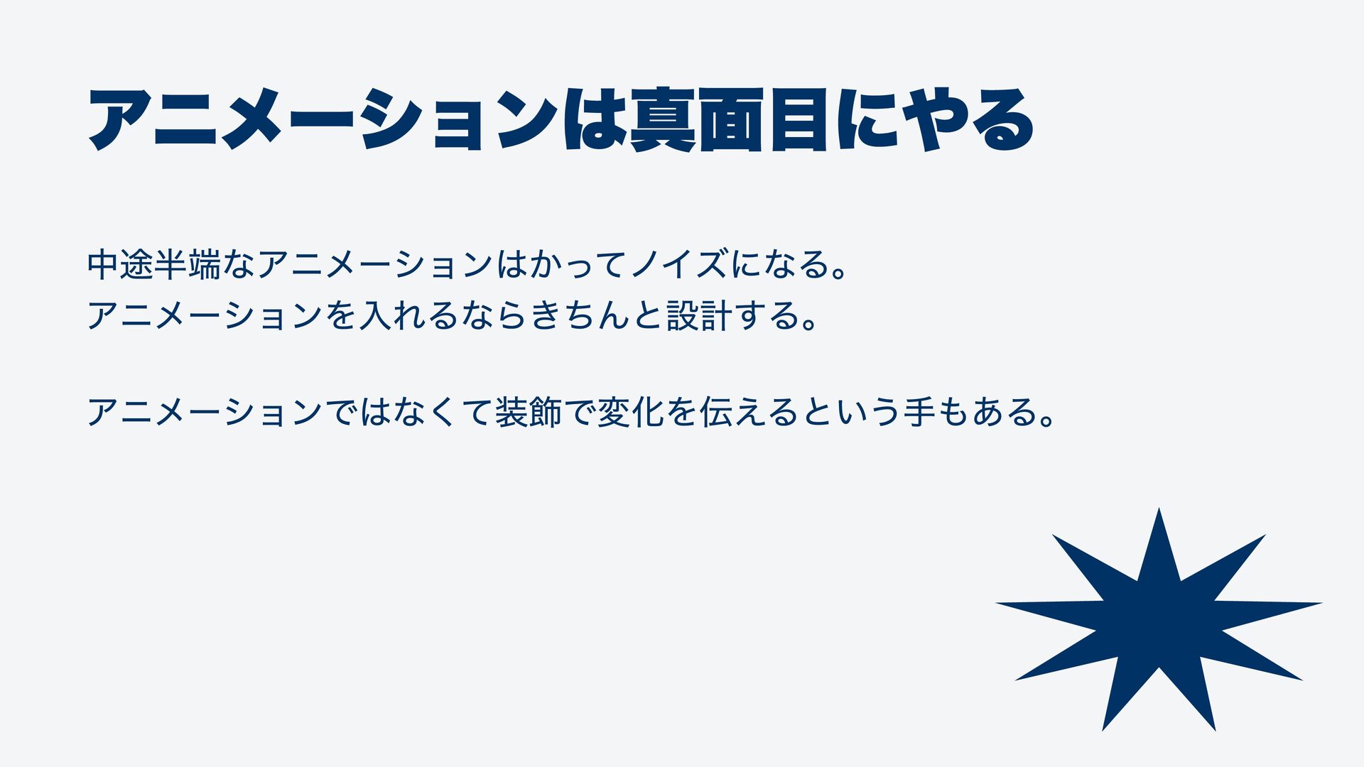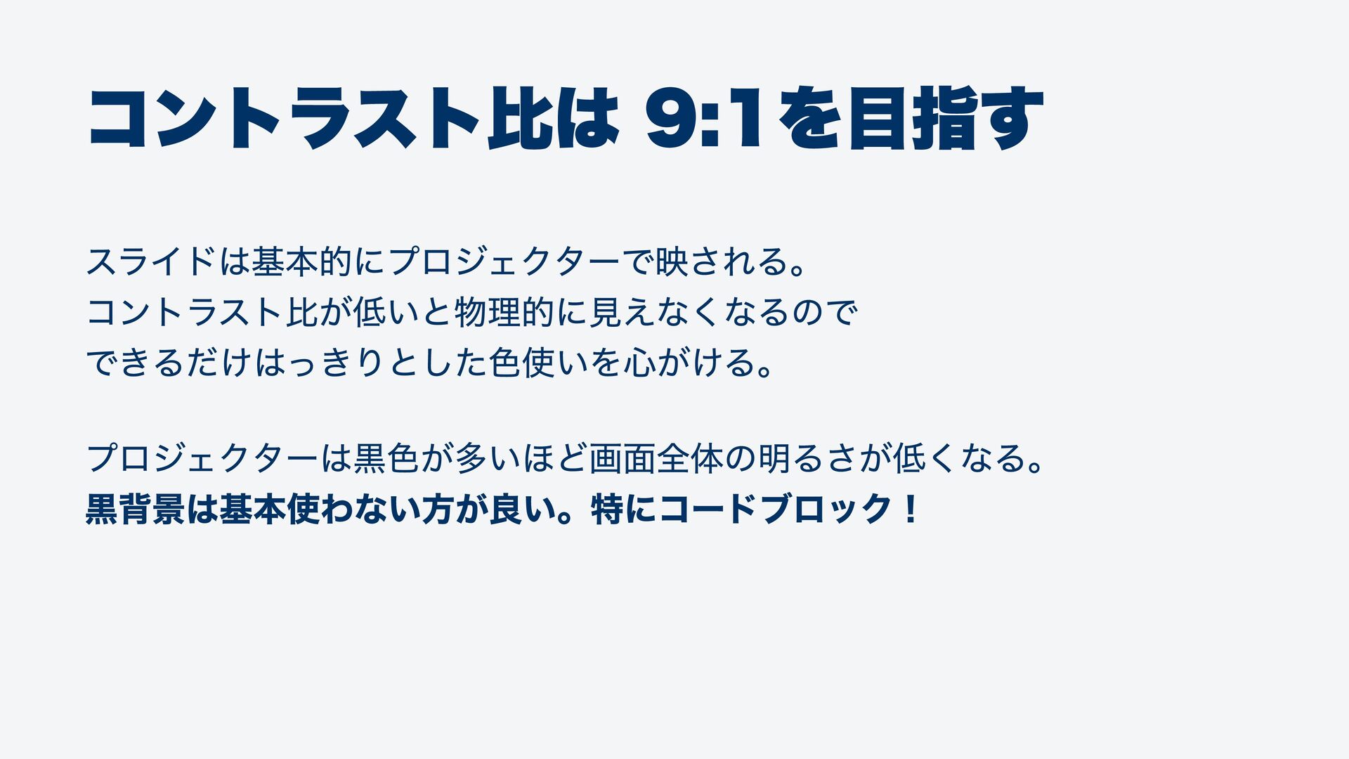 分 Part1 約 分 Part2 約 分 Part3 約 分 まとめ 約 分 5. コンテンツ 1スライド1メッセージ(タイトルで結論を言う) 1スライド5行以内の短い文章にする 箇条書き・階層構造(マークダウン的)は極力使わない コンテンツが「つながって」いる 無味乾燥なスライドや不要なアニメーションは排除する 6. ビジュアル・トンマナ カラー:ベース #003265(例)・アクセント #e69023(例) タイポグラフィ:最小フォントサイズ 48px ビジュアルの掟 左端揃え、余白を恐れない、コントラスト比 9:1、図解する、テキストのジャンプ率、