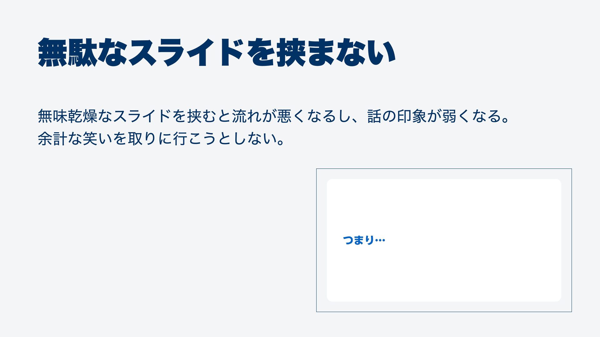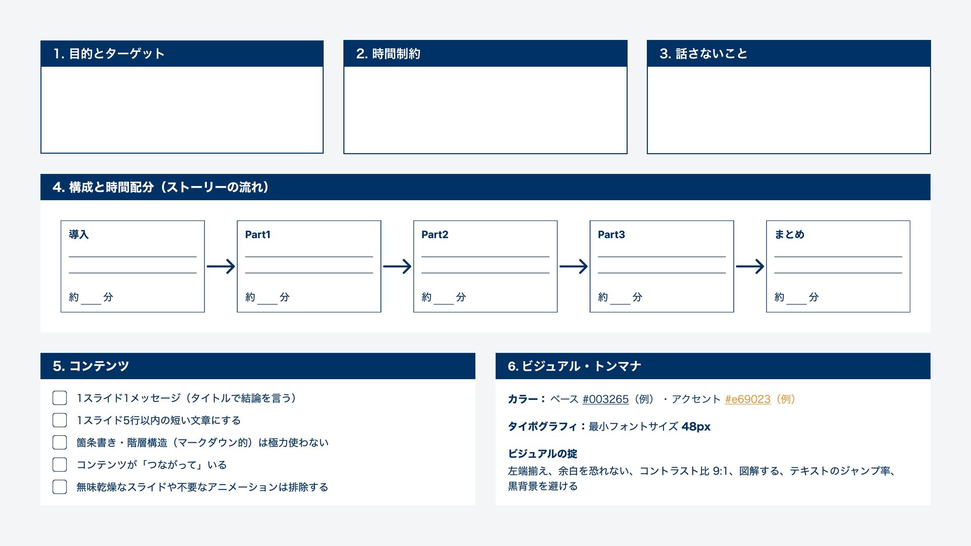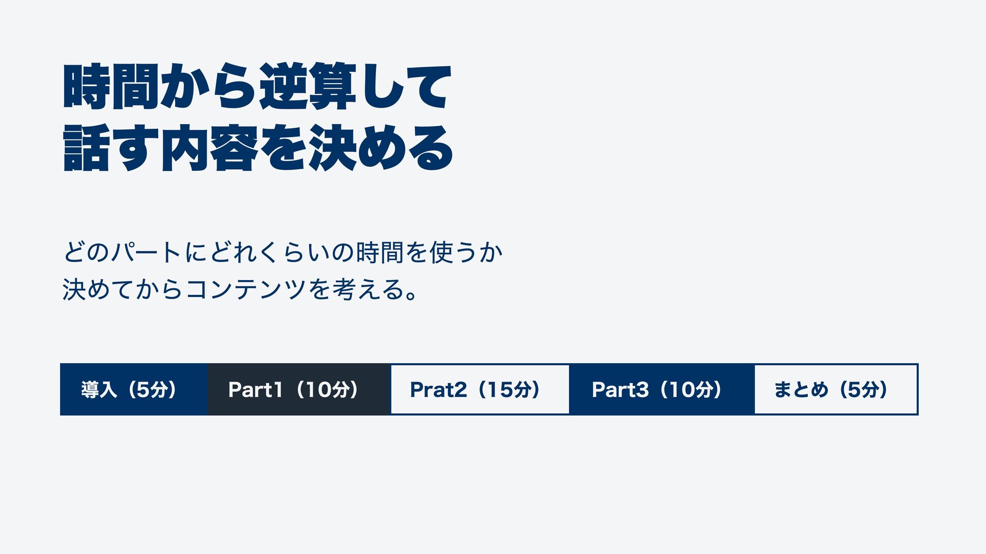 1. 1. 目的とターゲット 2. 時間制約 3. 話さないこと 4. 構成と時間配分(ストーリーの流れ) 導入 約