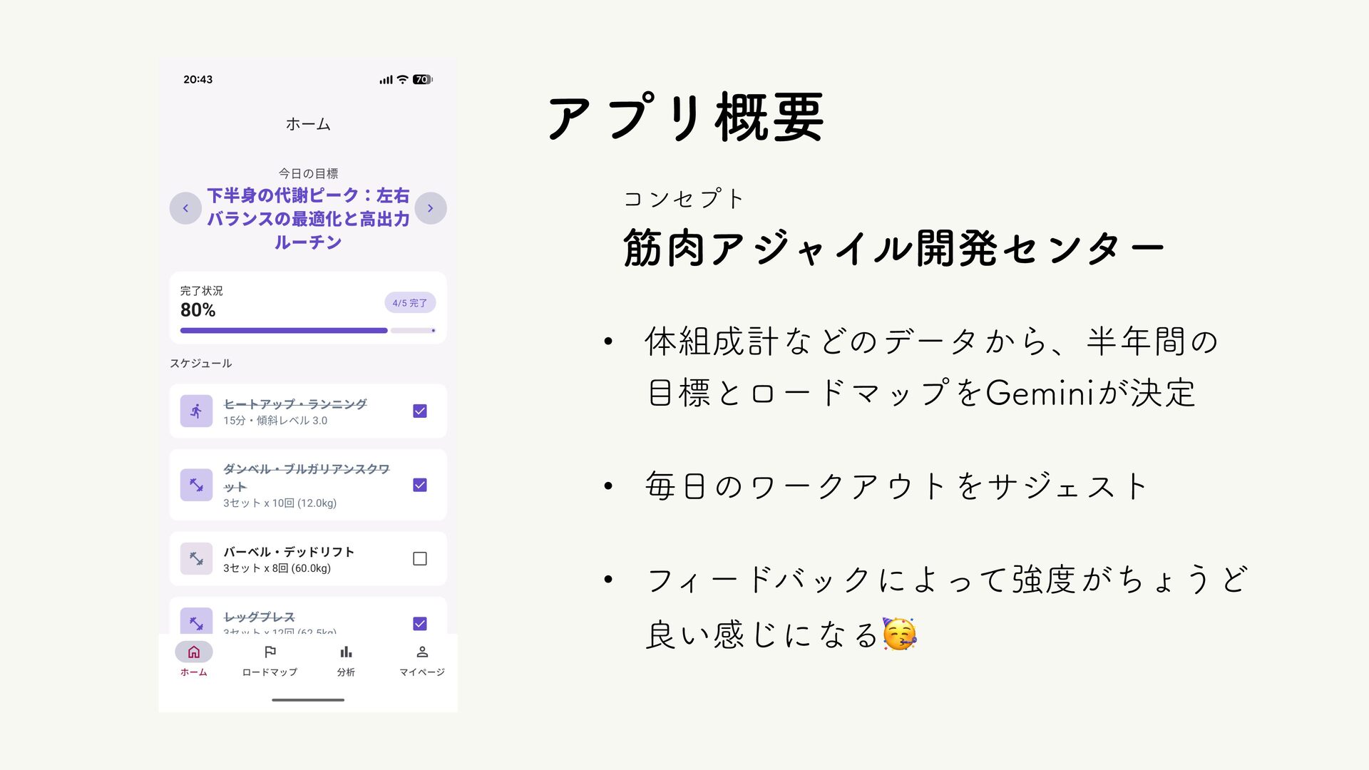 ΞϓϦ֓ཁ w ମܭͳͲͷσʔλ͔Βɺؒͷ ඪͱϩʔυϚοϓΛ(FNJOJ͕ܾఆ w ຖͷϫʔΫΞτΛαδΣετ w ϑΟʔυόοΫʹΑͬͯڧ͕ͪΐ͏Ͳ ྑ͍ײ͡ʹͳΔ🥳 ےΞδϟΠϧ։ൃηϯλʔ