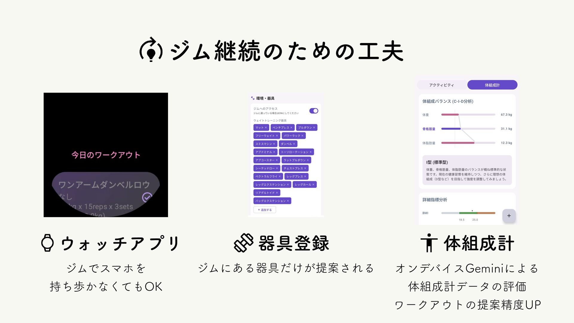 δϜܧଓͷͨΊͷ ث۩ొ ମܭ ΥονΞϓϦ δϜͰεϚϗΛ ࣋ͪา͔ͳͯ͘0, δϜʹ͋Δث۩͚͕ͩఏҊ͞ΕΔ ΦϯσόΠε(FNJOJʹΑΔ ମܭσʔλͷධՁ ϫʔΫΞτͷఏҊਫ਼61