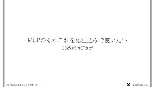 Takas(@DevTakas) MCPのあれこれを認証込みで使いたい MCPのあれこれを認証込みで使いたい 2025.05.NETラボ