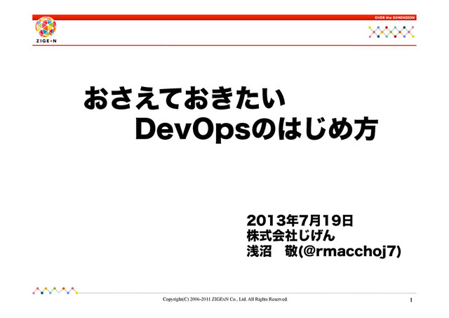 the DIMENSION 会社・自己紹介 ▪株式会社じげん バーティカルメディアと呼ばれる 情報の網羅性・検索性と一括申込み ・応募の利便性にこだわった、 比較検索型情報メディアを複数運営 しています。 ▪浅沼 敬 Twitter @rmacchoj7 Chefを書いたり、Jenkinsの設定を したり、fluentを仕込んだり、サイトの 開発もしたり。インフラからアプリケー ションまで幅広くやっています。 h"p://zigexn.co.jp/