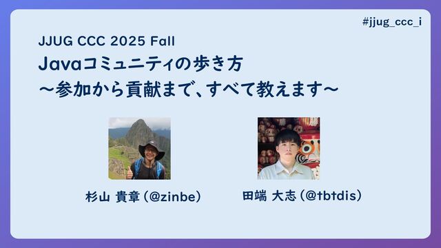 Javaコミュニティの歩き方 杉山 貴章(@zinbe) 〜参加から貢献まで、すべて教えます〜 田端 大志(@tbtdis) #jjug_ccc_i JJUG CCC 2025