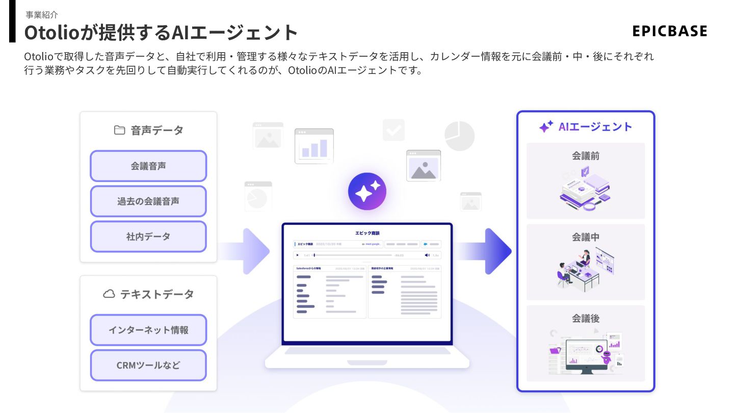 Otolioが提供するAIエージェント Otolioで取得した⾳声データと、⾃社で利⽤‧管理する様々なテキストデータを活⽤し、カレンダー情報を元に会議前‧中‧後にそれぞれ ⾏う業務やタスクを先回りして⾃動実⾏してくれるのが、OtolioのAIエージェントです。 事業紹介
