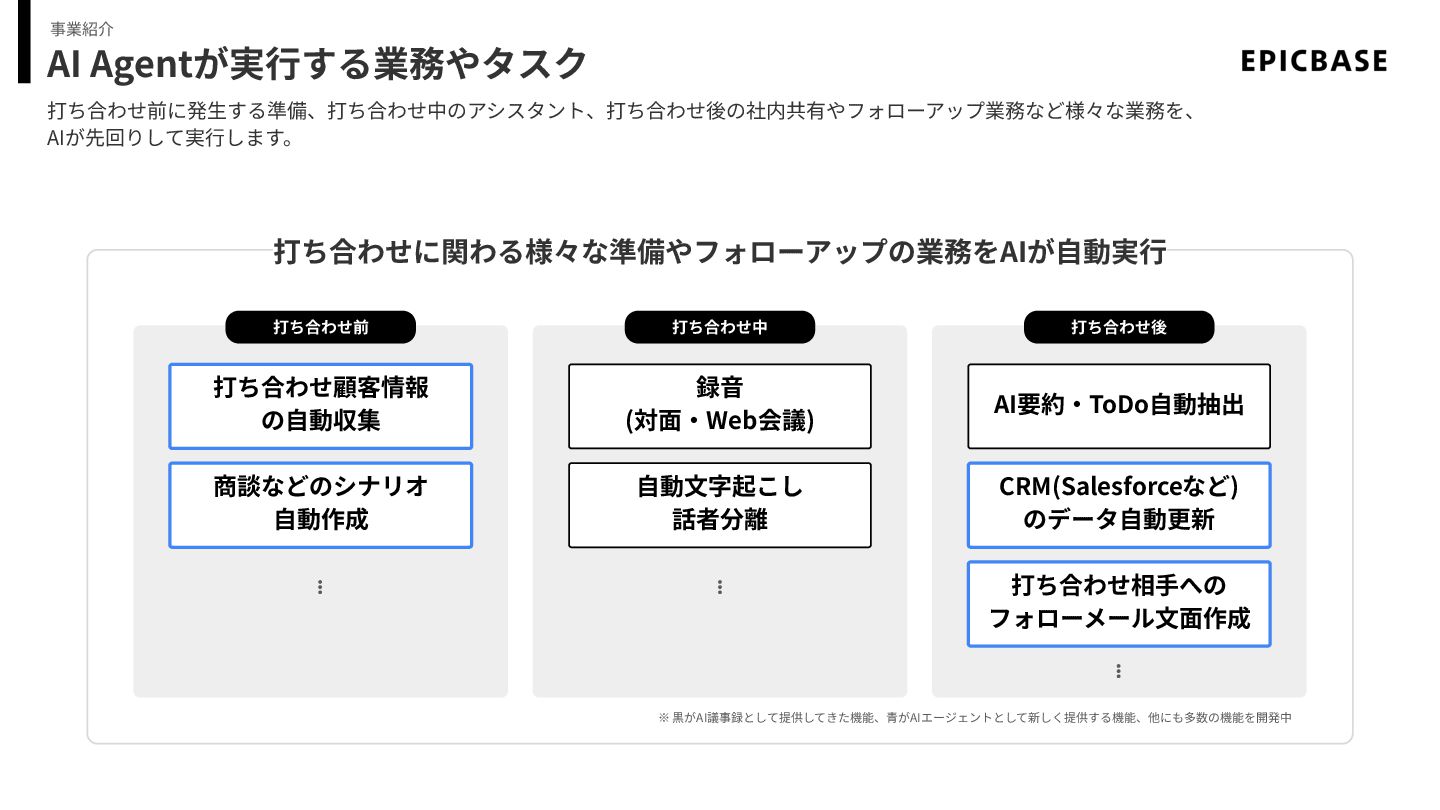 AI Agentが実⾏する業務やタスク 打ち合わせ前に発⽣する準備、打ち合わせ中のアシスタント、打ち合わせ後の社内共有やフォローアップ業務など様々な業務を、 AIが先回りして実⾏します。 事業紹介 打ち合わせに関わる様々な準備やフォローアップの業務をAIが⾃動実⾏ 打ち合わせ前 打ち合わせ中 打ち合わせ後 録⾳