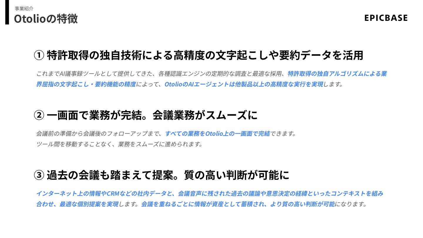 Otolioの特徴 事業紹介 ① 特許取得の独⾃技術による⾼精度の⽂字起こしや要約データを活⽤ これまでAI議事録ツールとして提供してきた、各種認識エンジンの定期的な調査と最適な採⽤、特許取得の独⾃アルゴリズムによる業 界屈指の⽂字起こし‧要約機能の精度によって、OtolioのAIエージェントは他製品以上の⾼精度な実⾏を実現します。 ② ⼀画⾯で業務が完結。会議業務がスムーズに 会議前の準備から会議後のフォローアップまで、すべての業務をOtolio上の⼀画⾯で完結できます。 ツール間を移動することなく、業務をスムーズに進められます。
