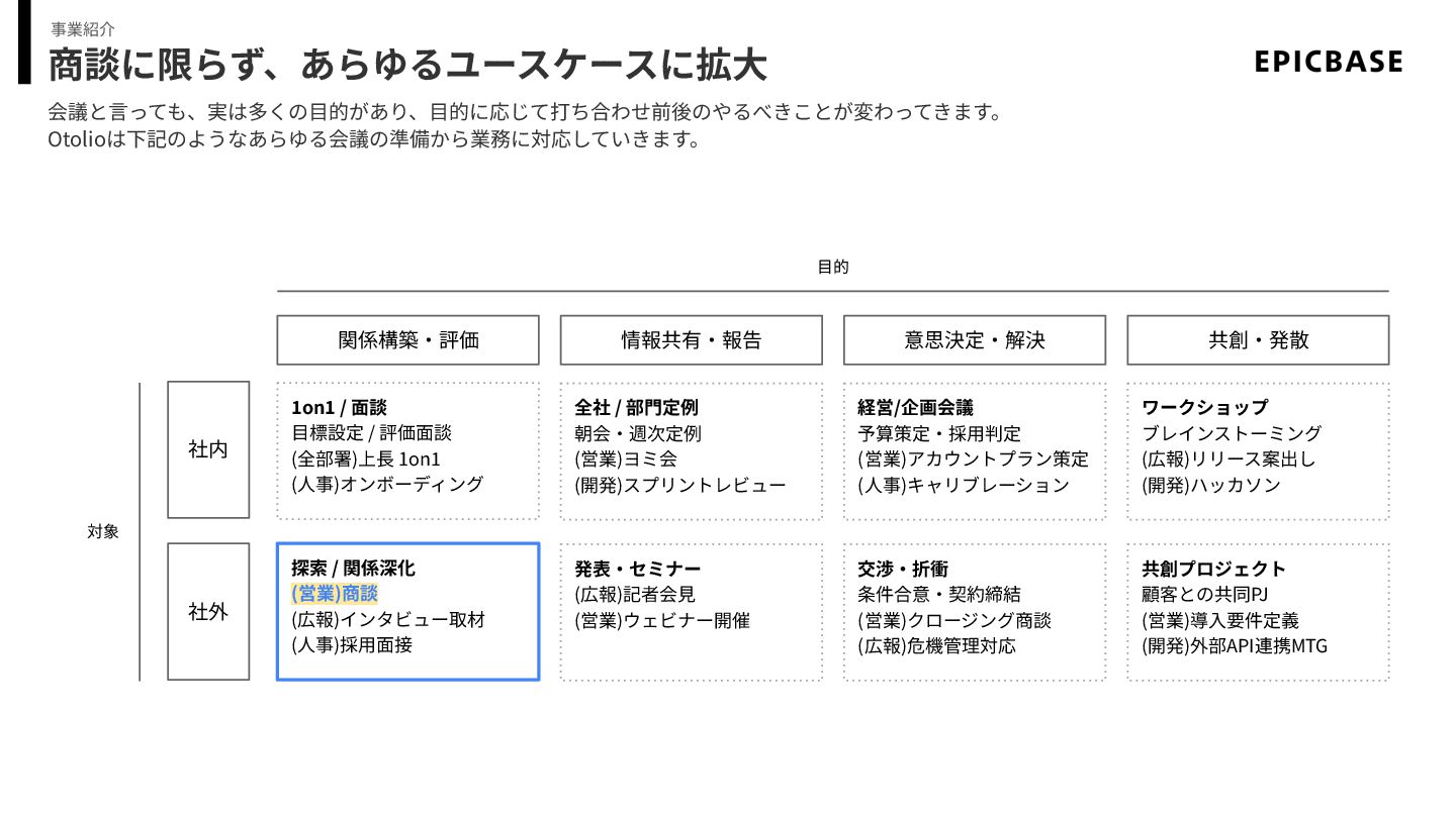 商談に限らず、あらゆるユースケースに拡⼤ 会議と⾔っても、実は多くの⽬的があり、⽬的に応じて打ち合わせ前後のやるべきことが変わってきます。 Otolioは下記のようなあらゆる会議の準備から業務に対応していきます。 事業紹介 社内 社外 対象 ⽬的 情報共有‧報告 意思決定‧解決