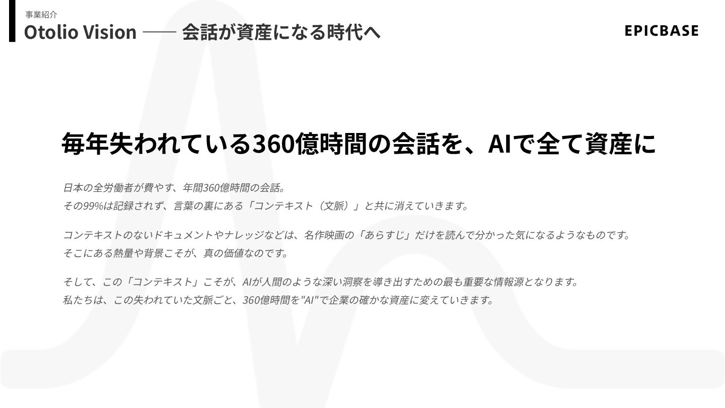 Otolio Vision ―― 会話が資産になる時代へ 事業紹介 毎年失われている360億時間の会話を、AIで全て資産に ⽇本の全労働者が費やす、年間360億時間の会話。 その99%は記録されず、⾔葉の裏にある「コンテキスト(⽂脈)」と共に消えていきます。 コンテキストのないドキュメントやナレッジなどは、名作映画の「あらすじ」だけを読んで分かった気になるようなものです。 そこにある熱量や背景こそが、真の価値なのです。