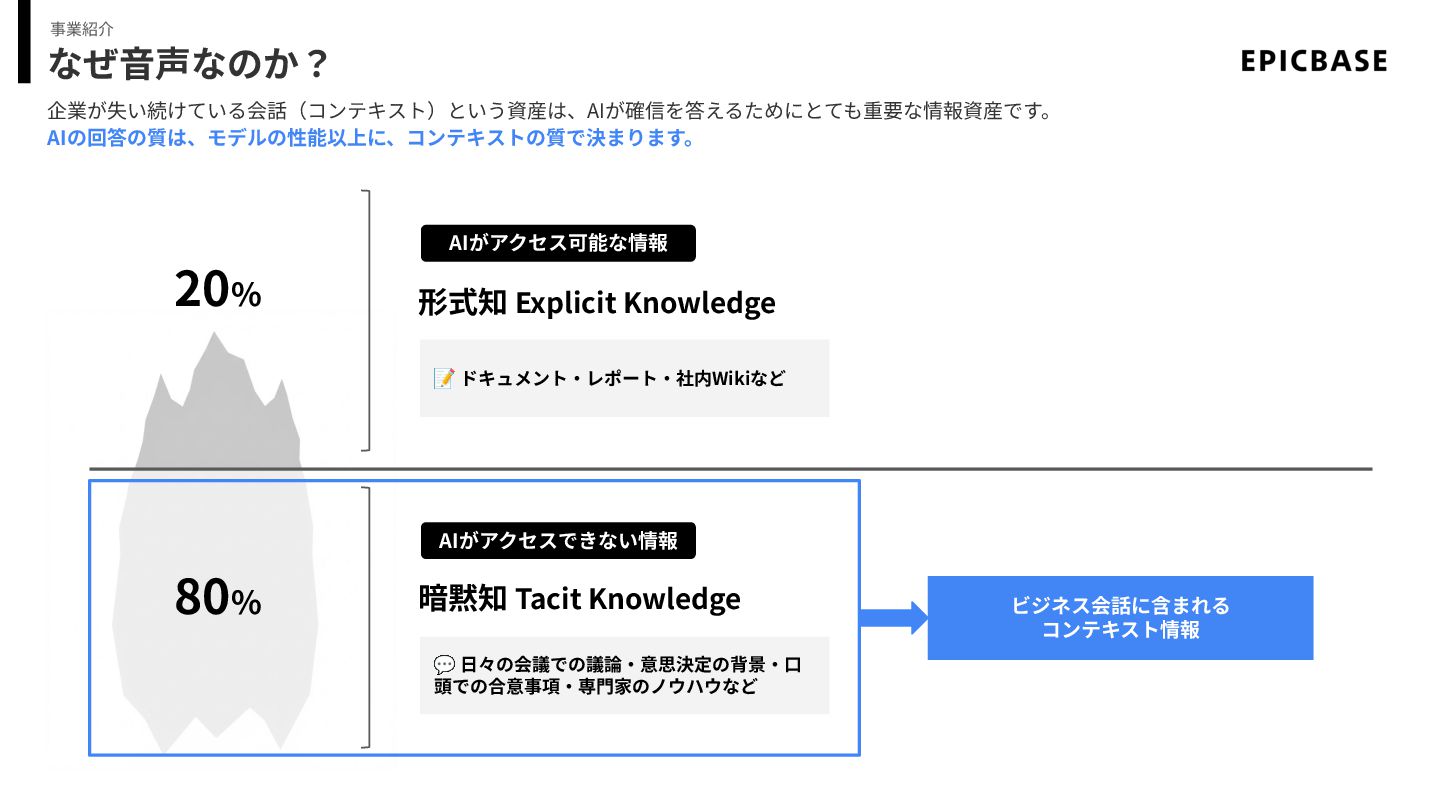 企業が失い続けている会話(コンテキスト)という資産は、AIが確信を答えるためにとても重要な情報資産です。 AIの回答の質は、モデルの性能以上に、コンテキストの質で決まります。 なぜ⾳声なのか? 事業紹介 形式知 Explicit Knowledge 20% 80% 暗黙知