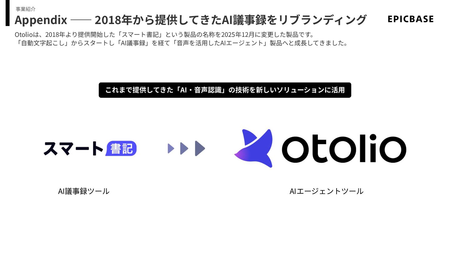 事業紹介 Appendix ―― 2018年から提供してきたAI議事録をリブランディング Otolioは、2018年より提供開始した「スマート書記」という製品の名称を2025年12⽉に変更した製品です。 「⾃動⽂字起こし」からスタートし「AI議事録」を経て「⾳声を活⽤したAIエージェント」製品へと成⻑してきました。 AI議事録ツール AIエージェントツール これまで提供してきた「AI‧⾳声認識」の技術を新しいソリューションに活⽤