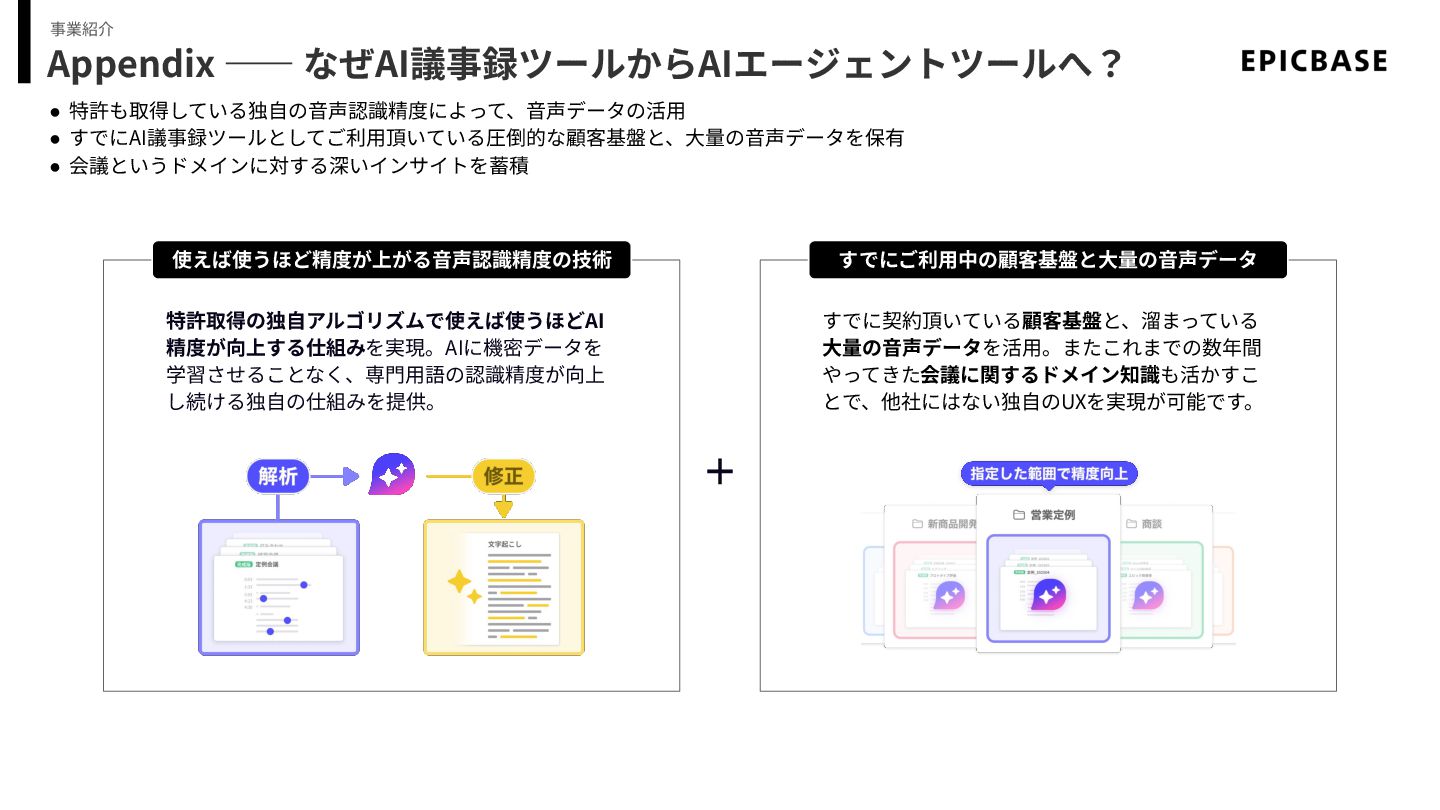Appendix ―― なぜAI議事録ツールからAIエージェントツールへ? • 特許も取得している独⾃の⾳声認識精度によって、⾳声データの活⽤ • すでにAI議事録ツールとしてご利⽤頂いている圧倒的な顧客基盤と、⼤量の⾳声データを保有 • 会議というドメインに対する深いインサイトを蓄積 事業紹介