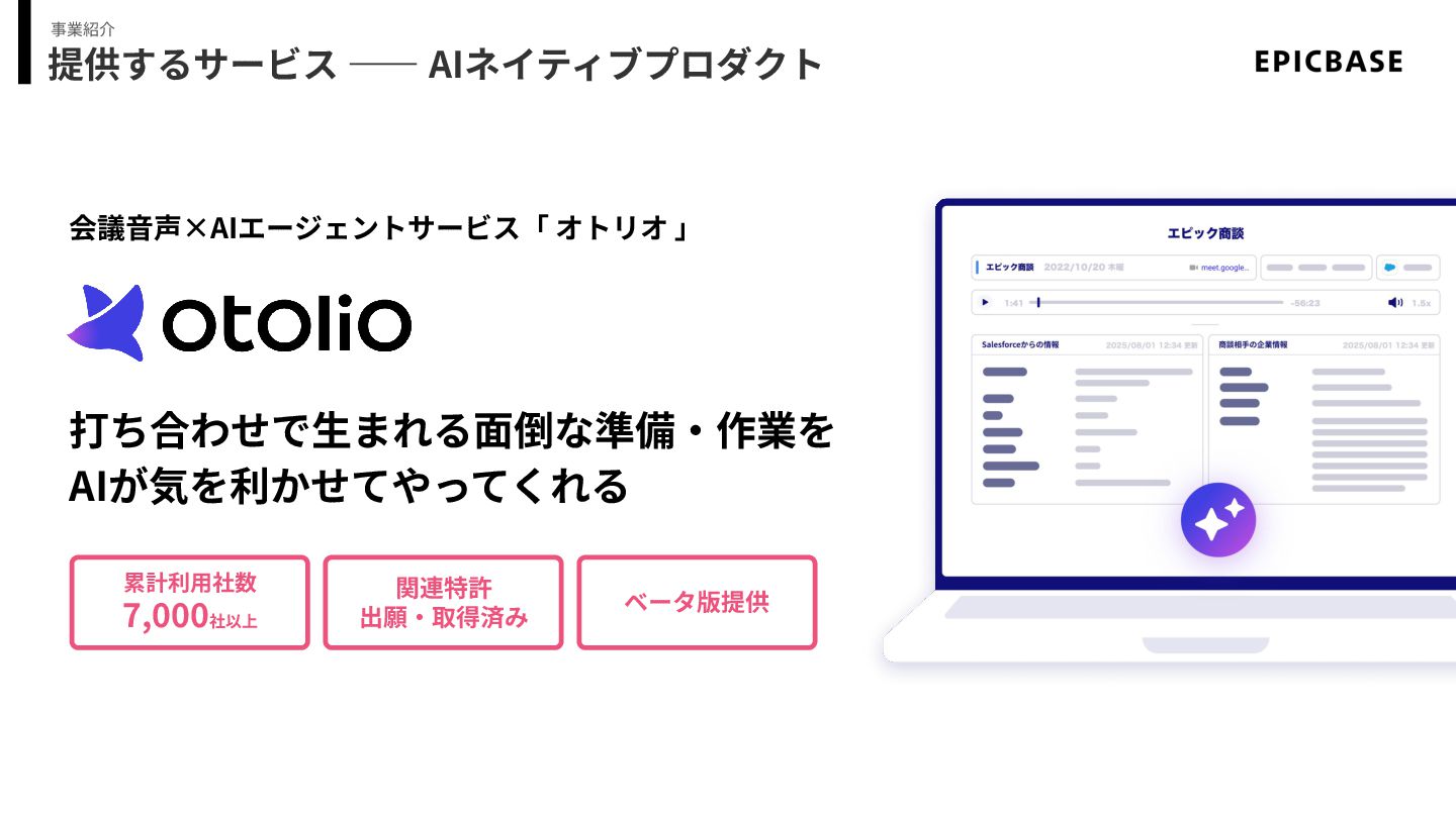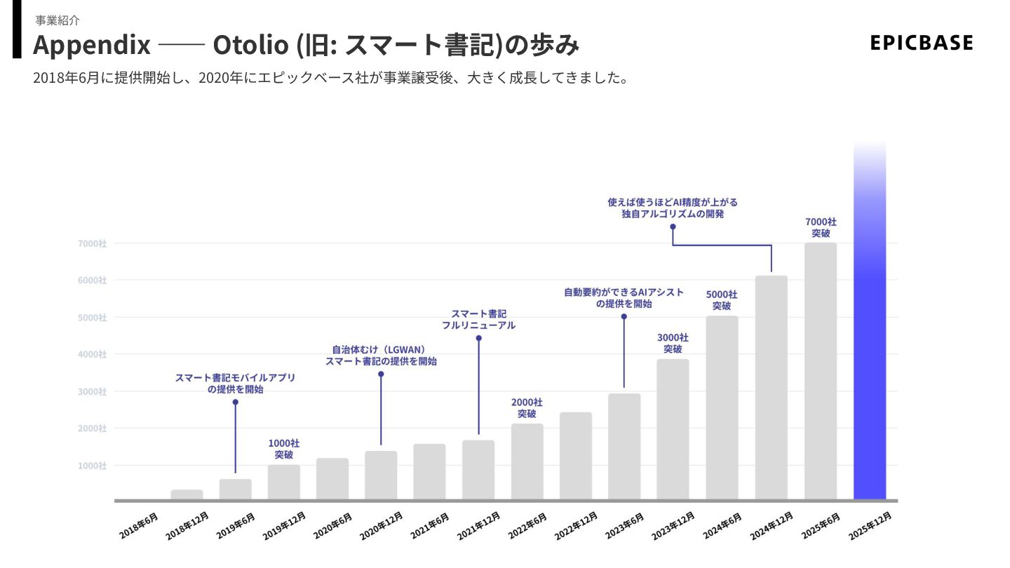 Appendix ―― Otolio (旧: スマート書記)の歩み 2018年6⽉に提供開始し、2020年にエピックベース社が事業譲受後、⼤きく成⻑してきました。 事業紹介